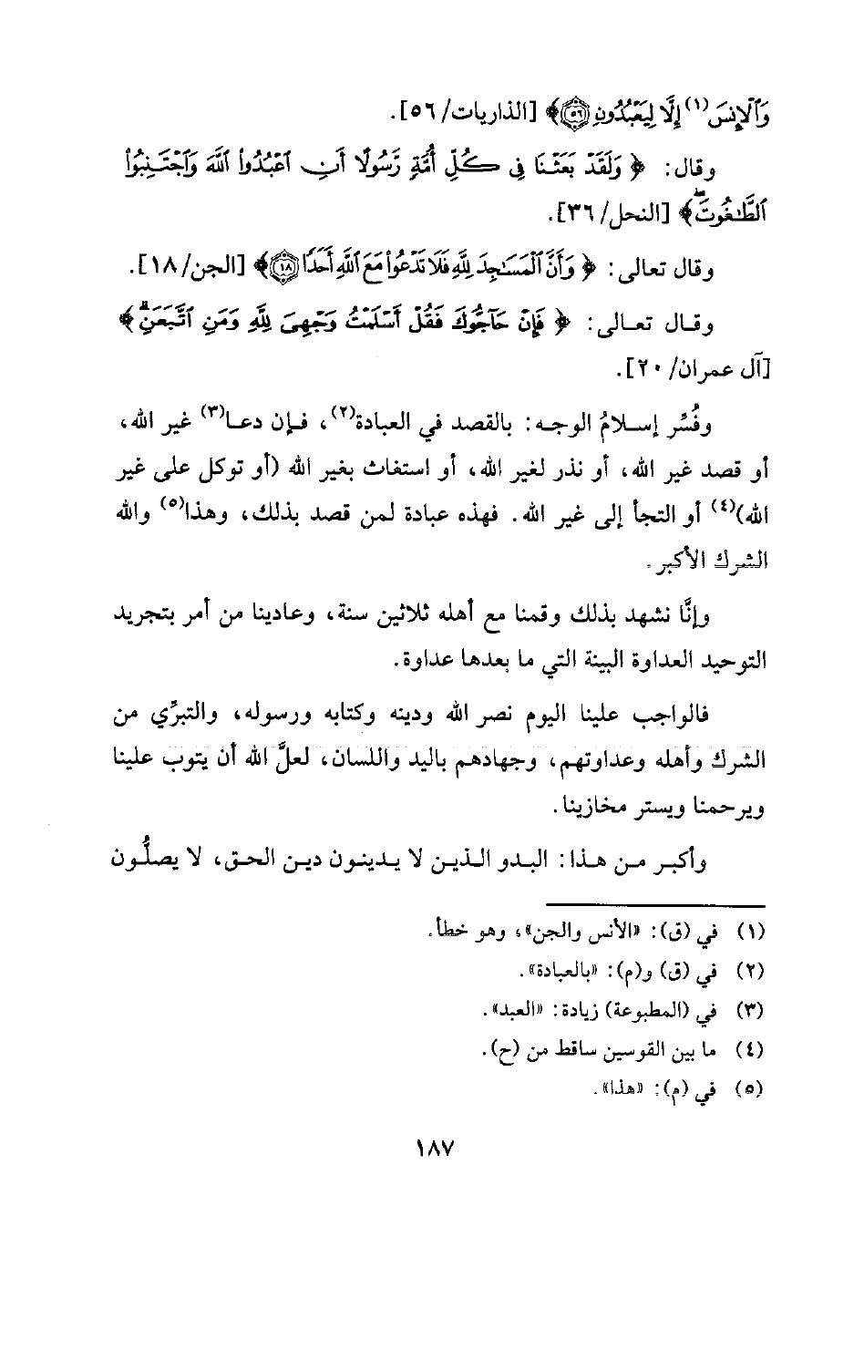 وقال: {وَلَقَدْ بَعَثْنَا فِي كُلِّ أُمَّةٍ رَسُولًا أَنِ اُعْبُدُوا اللَّهَ وَاجْتَنِبُوا الطَّاغُوتَ} [النحل: 36] وقال تعالى: {وَأَنَّ الْمَسَاجِدَ لِلَّهِ فَلَا تَدْعُوا مَعَ اللَّهِ أَحَدًا} [الجن: 18] وقال تعالى: {فَإِنْ حَاجُّوكَ فَقُلْ أَسْلَمْتُ وَجْهِيَ لِلَّهِ وَمَنِ اتَّبَعَنِ} [آل عمران: 20] وفسر إسلام الوجه: بالقصد في العبادة في (¬1) فإن دعا (¬2) غير الله، أو قصد غير الله، أو نذر لغير الله، أو استغاث بغير الله (أو توكل على غير الله) (¬3) أو التجأ إلى غير الله. فهذه عبادة لمن قصد بذلك، وهذا (¬4) والله الشرك أكبر. وإنا نشهد بذلك وقمنا مع أهله ثلاثين سنة، وعادينا من أمر بتجريد التوحيد العداوة البينة التي ما بعدها عداوة. فالواجب علينا اليوم نصر الله ودينه وكتابه ورسوله، والتبري من الشرك وأهله وعداوتهم، وجهادهم باليد واللسان، لعل الله أن يتوب علينا ويرحمنا ويستر مخازينا. وأكبر من هذا: البدو الذين لا يدينون دين الحق، لا يصلون