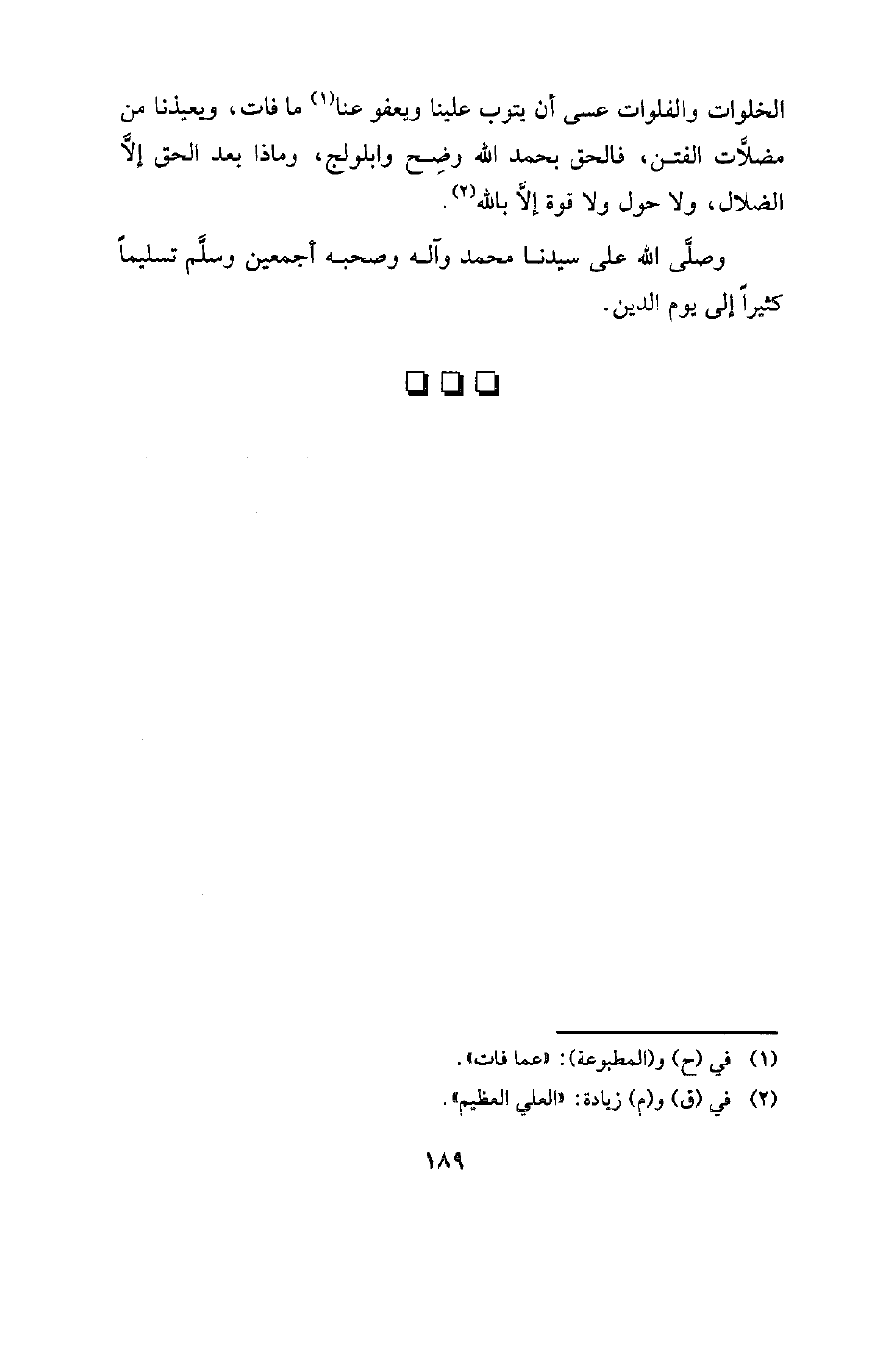 الخلوات والفلوات عسى أن يتوب علينا ويعفو عنا (¬1) ما فات، ويعيذنا من مضلات الفتن، فالحق بحمد الله وضح وابلولج، وماذا بعد الحق إلا الضلال, ولا حول ولا قوة إلا بالله (¬2) وصلى الله على سيدنا محمد وآله وصحبه أجمعين وسلم تسليما كثيرا إلى يوم الدين.