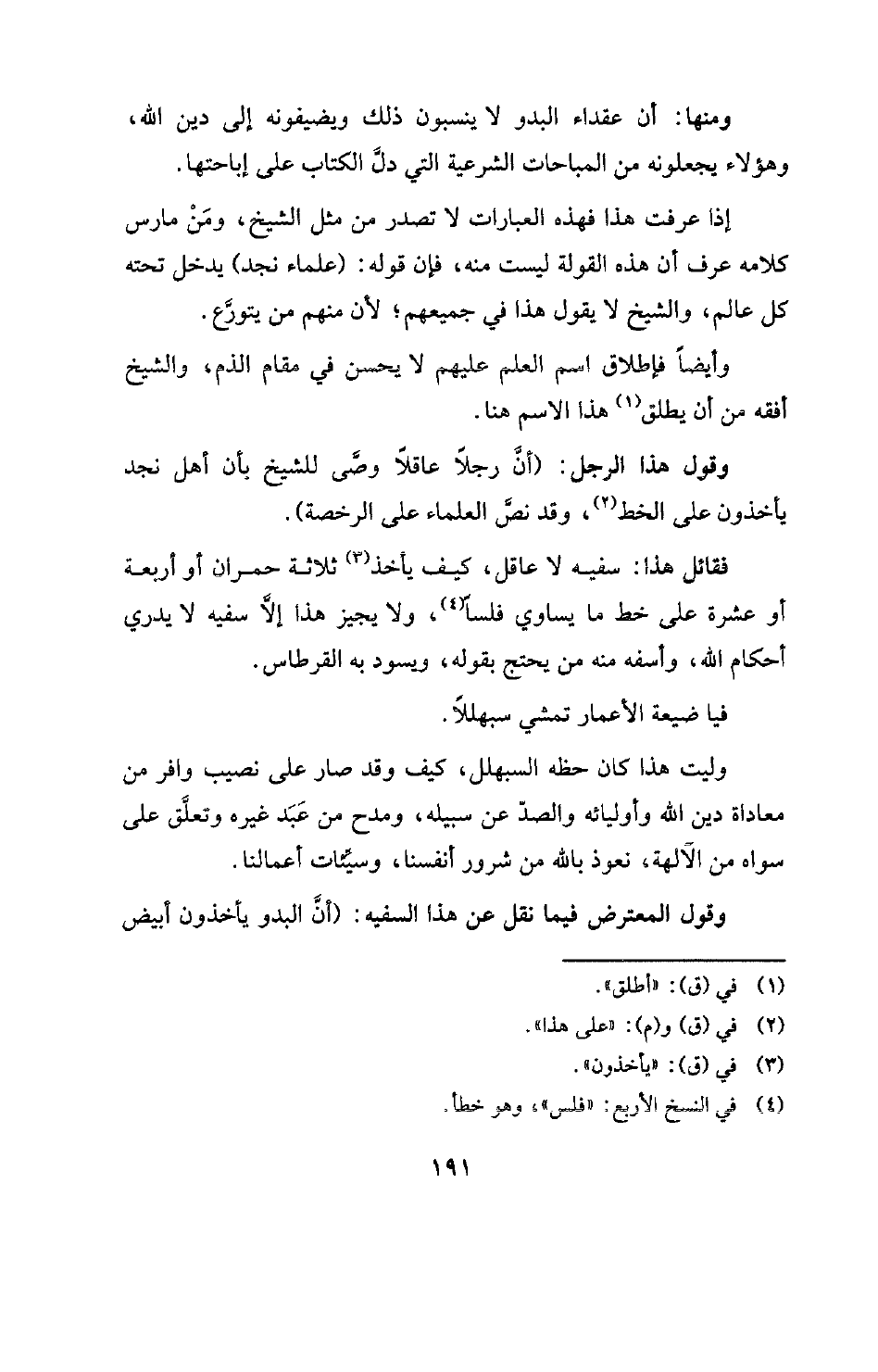 وليت هذا كان حظه السبهلل، كيف وقد صار على نصيب وافر من معاداة دين الله وأوليائه والصد عن سبيله، ومدح من عبد غيره وتعلق على سواه من الآلهة، نعوذ بالله من شرور أنفسنا، وسيئات أعمالنا. وقول المعترض فيما نقل عن هذا السفيه: (أن البدو يأخذون أبيض