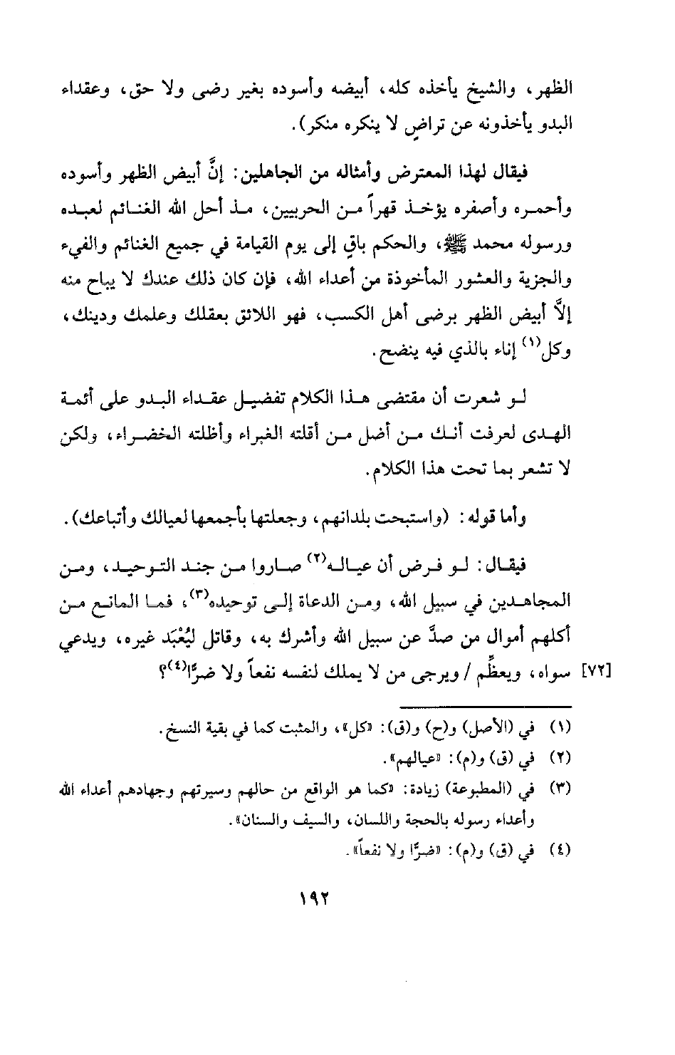 الظهر، والشيخ يأخذه كله، أبيضه وأسوده بغير رضى ولا حق، وعقداء البدو يأخذونه عن تراض لا ينكره منكر) . فيقال لهذا المعترض وأمثاله من الجاهلين: إن أبيض الظهر وأسوده وأحمره وأصفره يؤخذ قهرا من الحربيين، مذ أحل الله الغنائم لعبده ورسوله محمد صلى الله عليه وسلم، والحكم باق إلى يوم القيامة في جميع الغنائم والفيء والجزية والعشور المأخوذة من أعداء الله، فإن كان ذلك عندك لا يباح منه إلا أبيض الظهر برضى أهل الكسب، فهو اللائق بعقلك وعلمك ودينك، وكل (¬1) إناء بالذي فيه ينضح. لو شعرت أن مقتضى هذا الكلام تفضيل عقداء البدو على أئمة الهدى لعرفت أنك من أضل من أقلته الغبراء وأظلته الخضراء، ولكن لا تشعر بما تحت هذا الكلام.