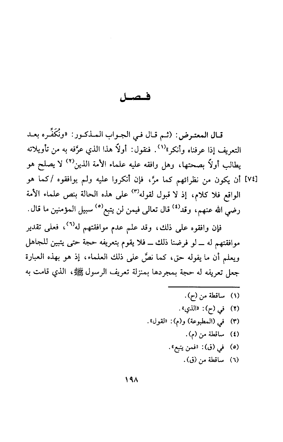 فصل قال المعترض: (ثم قال في الجواب المذكور: "ونكفره بعد التعريف إذا عرفناه وأنكر! (¬1) فنقول: أولا هذا الذي عرفه به من تأويلاته يطالب أولا بصحتها، وهل وافقه عليه علماء الأمة الذين (¬2) لا يصلح هو [74] ، أن يكون من نظرائهم كما مر، فإن أنكروا عليه ولم يوافقوه كما هو الواقع فلا كلام، إذ لا قبول لقوله (¬3) على هذه الحالة بنص علماء الأمة رضي الله عنهم، وقد (¬4) قال تعالى فيمن لن يتبع (¬5) سبيل المؤمنين ما قال. فإن وافقوه على ذلك، وقد علم عدم موافقتهم له (¬6) فعلى تقدير موافقتهم له- لو فرضنا ذلك- فلا يقوم بتعريفه حجة حتى يتبين للجاهل ويعلم أن ما يقوله حق، كما نص على ذلك العلماء، إذ هو بهذه العبارة جعل تعريفه له حجة بمجردها بمنزلة تعريف الرسول صلى الله عليه وسلم، الذي قامت به