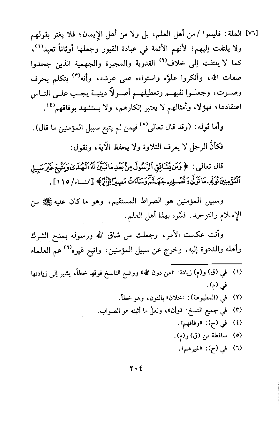 الملة: فليسوا من أهل العلم، بل ولا من أهل الإيمان؛ فلا يغتر بقولهم ولا يلتفت إليهم؛ لأنهم الأئمة في عبادة القبور وجعلها أوثانا تعبد (¬1) كما لا يلتفت إلى خلاف (¬2) . القدرية والمجبرة والجهمية الذين جحدوا صفات الله، وأنكروا علوه واستواءه على عرشه، وأنه (¬3) . يتكلم بحرف وصوت، وجعلوا نفيهم وتعطيلهم أصولا دينية يجب على الناس اعتقادها؟ فهؤلاء وأمثالهم لا يعتبر إنكارهم، ولا يستشهد بوفاقهم (¬4) .