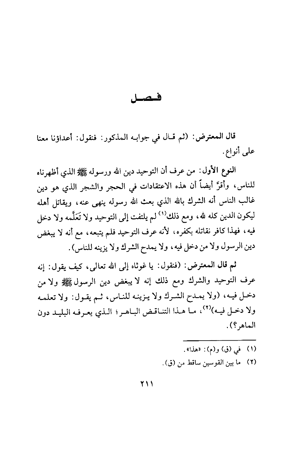 النوع الأول: من عرف أن التوحيد دين الله ورسوله صلى الله عليه وسلم الذي أظهرناه للناس، وأقر أيضا أن هذه الاعتقادات في الحجر والشجر الذي هو دين غالب الناس أنه الشرك بالله الذي بعث الله رسوله ينهى عنه، ويقاتل أهله ليكون الدين كله لله، ومع ذلك (¬1) لم يلتفت إلى التوحيد ولا تعلمه ولا دخل فيه، فهذا كافر نقاتله بكفره، لأنه عرف التوحيد فلم يتبعه، مع أنه لا يبغض دين الرسول ولا من دخل فيه، ولا يمدح الشرك ولا يزينه للناس) .