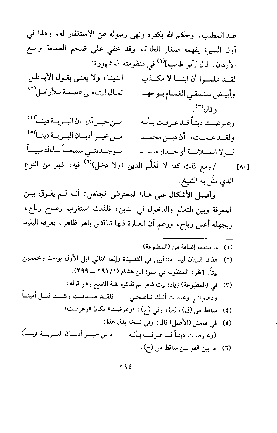 عبد المطلب، وحكم الله بكفره ونهى رسوله عن الاستغفار له، وهذا في أول السيرة يفهمه صغار الطلبة، وقد خفي على ضخم العمامة واسع الأردان. قال [أبو طالب] ، (¬1) في منظومته المشهورة: