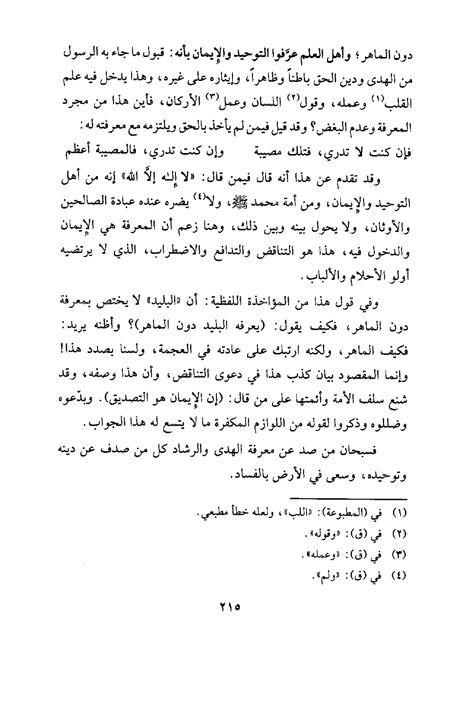 وفي قول هذا من المؤاخذة اللفظية: أن "البليد" لا يختص بمعرفة دون الماهر، فكيف يقول: (يعرفه البليد دون الماهر) ؟ وأظنه يريد: فكيف الماهر، ولكنه ارتبك على عادته في العجمة، ولسنا بصدد هذا! وإنما المقصود بيان كذب هذا في دعوى التناقض، وأن هذا وصفه، وقد شنع سلف الأمة وأئمتها على من قال: (إن الإيمان هو التصديق) . وبدعوه وضللوه وذكروا لقوله من اللوازم المكفرة ما لا يتسع له هذا الجواب.