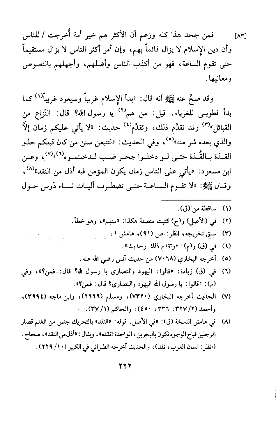 فمن جحد هذا كله وزعم أن الأكثر هم خير أمة أخرجت للناس وأن دين الإسلام لا يزال قائما بهم، وإن أمر أكثر الناس لا يزال مستقيما حتى تقوم الساعة، فهو من أكذب الناس وأضلهم، وأجهلهم بالنصوص ومعانيها.