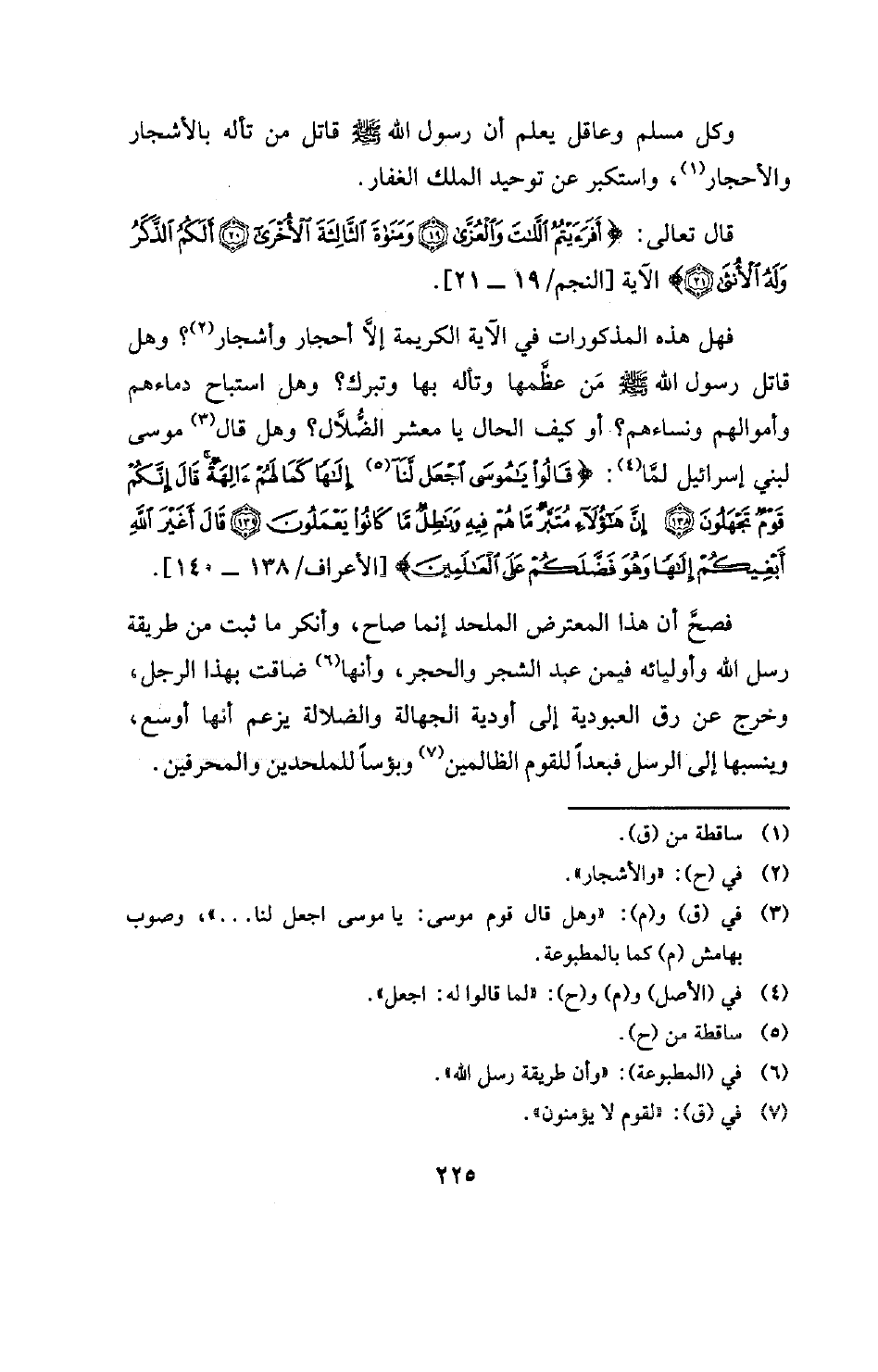 فهل هذه المذكورات في الآية الكريمة إلا أحجار وأشجار (¬2) وهل قاتل رسول الله صلى الله عليه وسلم من عظمها وتأله بها وتبرك؟ وهل استباح دماءهم وأموالهم ونساءهم؟ أو كيف الحال يا معشر الضلال؟ وهل قال (¬3) موسى لبني إسرائيل لما (¬4) {قَالُوا يَا مُوسَى اجْعَلْ لَنَا (¬5) إِلَهًا كَمَا لَهُمْ آلِهَةٌ قَالَ إِنَّكُمْ قَوْمٌ تَجْهَلُونَ - إِنَّ هَؤُلَاءِ مُتَبَّرٌ مَا هُمْ فِيهِ وَبَاطِلٌ مَا كَانُوا يَعْمَلُونَ - قَالَ أَغَيْرَ اللَّهِ أَبْغِيكُمْ إِلَهًا وَهُوَ فَضَّلَكُمْ عَلَى الْعَالَمِينَ} [الأعراف: 138 - 140] [الأعراف / 138 - 140] .