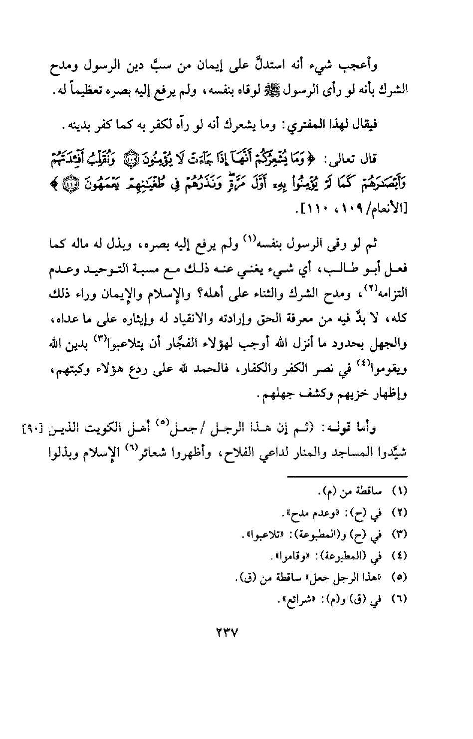 ثم لو وقى الرسول بنفسه (¬1) ولم يرفع إليه بصره، وبذل له ماله كما فعل أبو طالب، أي شيء يغني عنه ذلك مع مسبة التوحيد وعدم التزامه (¬2) ومدح الشرك والثناء على أهله؟ والإسلام والإيمان وراء ذلك كله، لا بد فيه من معرفة الحق وإمارته والانقياد له وإيثاره على ما عداه، والجهل بحدود ما أنزل الله أوجب لهؤلاء الفجار أن يتلاعبوا (¬3) بدين الله ويقوموا (¬4) في نصر الكفر والكفار، فالحمد لله على ردع هؤلاء وكبتهم، وإظهار خزيهم وكشف جهلهم.