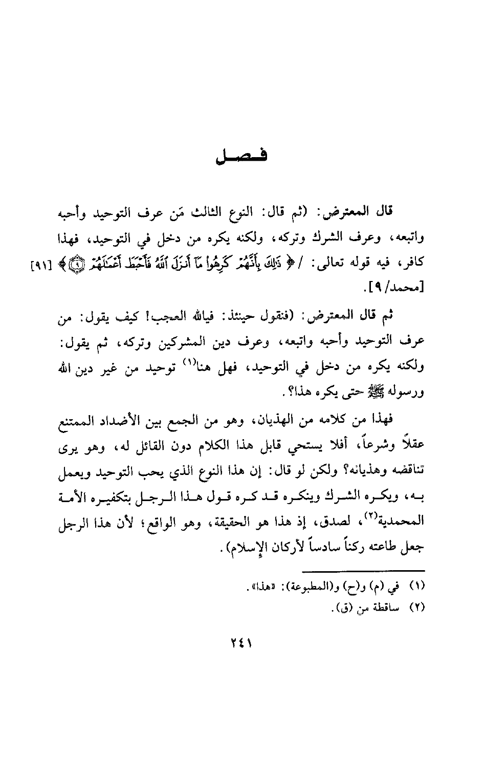فصل قال المعترض: (ثم قال: النوع الثالث من عرف التوحيد وأحبه واتبعه، وعرف الشرك وتركه، ولكنه يكره من دخل في التوحيد، فهذا كافر، فيه قوله تعالى: {ذَلِكَ بِأَنَّهُمْ كَرِهُوا مَا أَنْزَلَ اللَّهُ فَأَحْبَطَ أَعْمَالَهُمْ} [محمد: 9] [محمد / 9] .