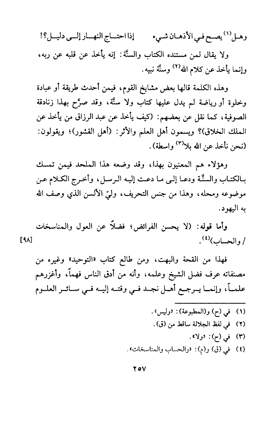 وأما قوله: "لا يحسن الفرائض؟ فضلا عن العول والمناسخات والحساب) (¬4) فهذا من القحة والبهت، ومن طالع كتاب "التوحيد وغيره من مصنفاته عرف فضل الشيخ وعلمه، وأنه من أدق الناس فهما، وأغزرهم علما، وإنما يرجع أهل نجد في وقته إليه في سائر العلوم