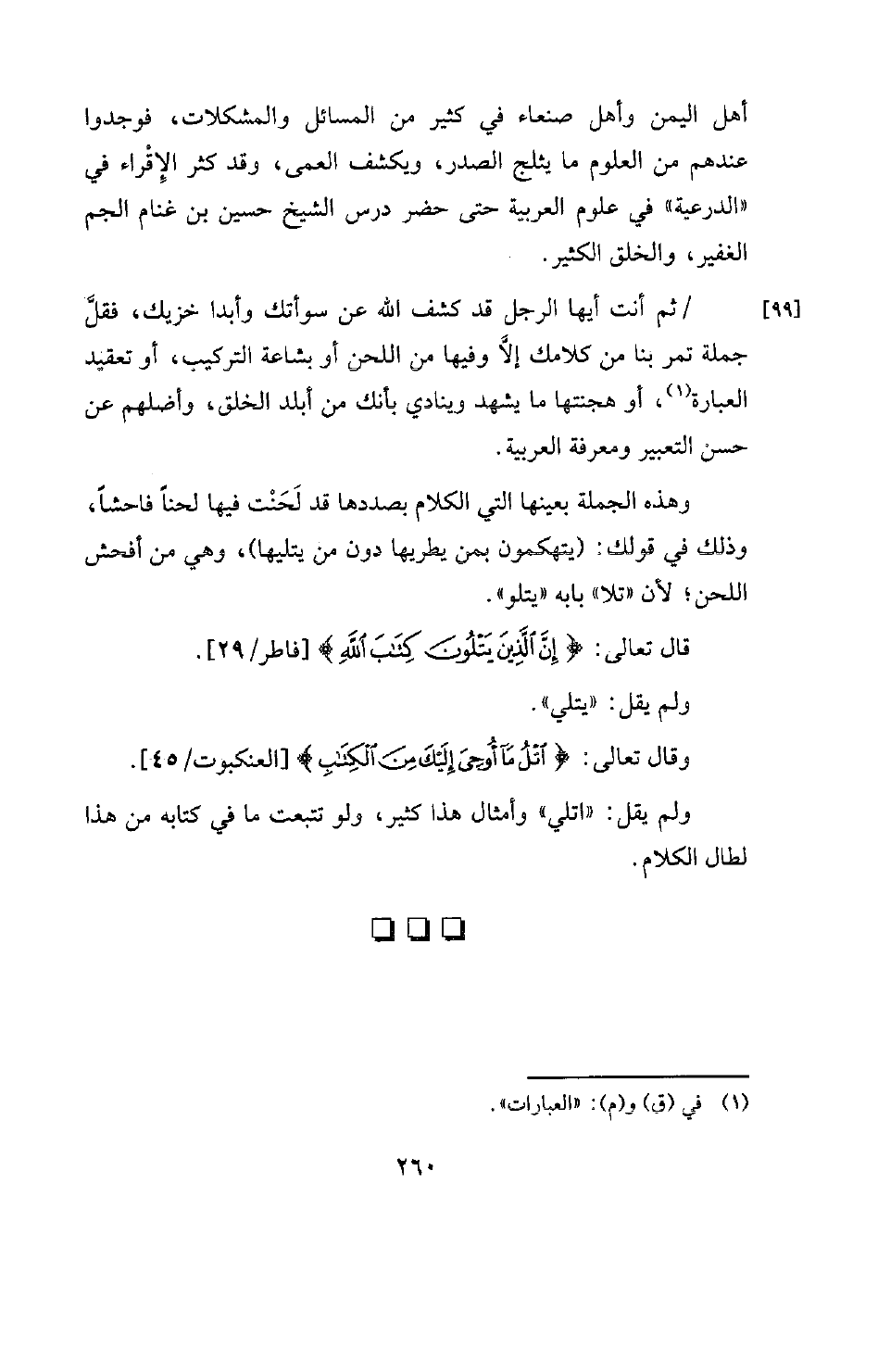 وهذه الجملة بعينها التي الكلام بصددها قد لحنت فيها لحنا فاحشا، وذلك في قولك: (يتهكمون بمن يطريها دون من يتليها) ، وهي من "أفحش " اللحن؟ لأن " تلا " بابه " يتلو".