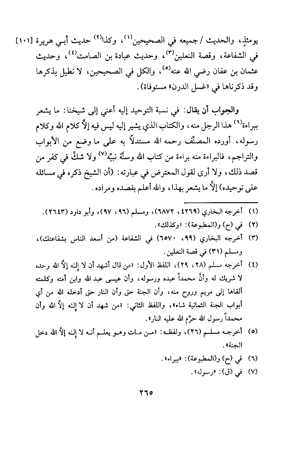والجواب أن يقال: في نسبة التوحيد إليه أعني إلى شيخنا: ما يشعر ببراءة (¬6) هذا الرجل منه، والكتاب الذي يشير إليه ليس فيه إلا كلام الله وكلام رسوله، أورده المصنف رحمه الله مستدلا به على ما وضع من الأبواب والتراجم، فالبراءة منه براءة من كتاب الله وسنة نبيه (¬7) ولا شك في كفر من قصد ذلك، ولا أرى لقول المعترض في عبارته: (أن الشيخ ذكره في مسائله على توحيده) إلا ما يشعر بهذا، والله أعلم بقصده ومراده.