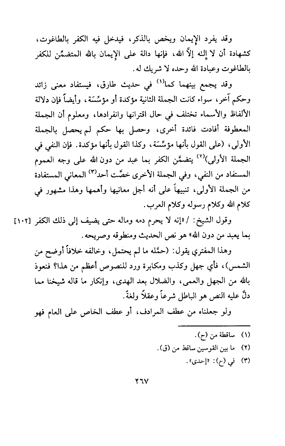 وقد يفرد الإيمان ويخص بالذكر، فيدخل فيه الكفر بالطاغوت، كشهادة أن لا إله إلا لله، فإنها دالة على الإيمان بالله المتضمن للكفر بالطاغوت وعبادة الله وحده لا شريك له.