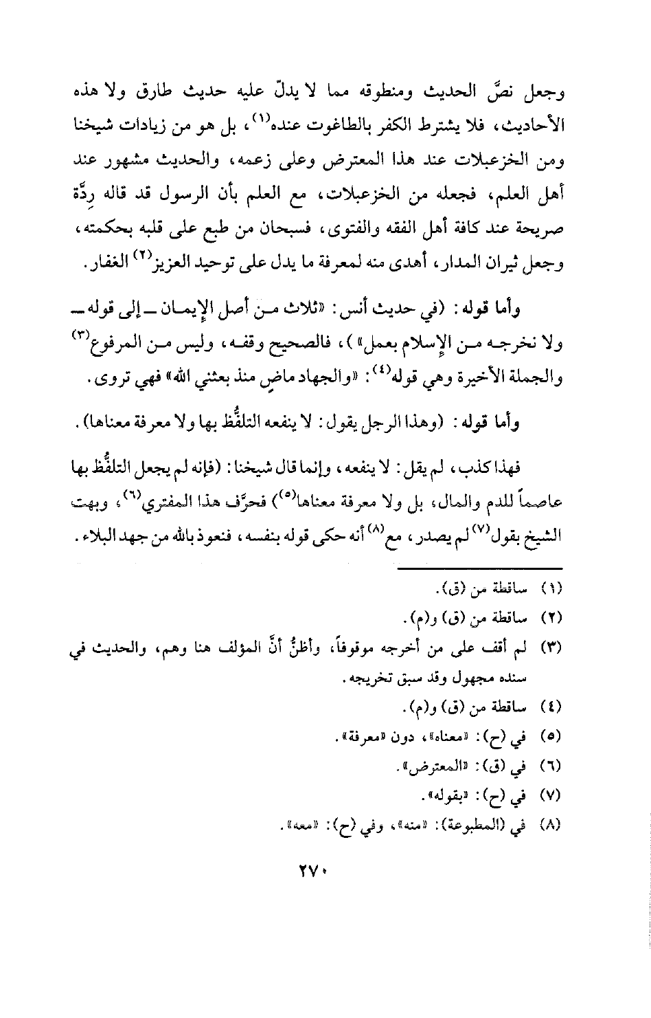 وجعل نص الحديث ومنطوقه مما لا يدل عليه حديث طارق ولا هذه الأحاديث، فلا يشترط الكفر بالطاغوت عنده (¬1) بل هو من زيادات شيخنا، ومن الخزعبلات عند هذا المعنى وعلى زعمه، والحديث مشهور عند أهل العلم، فجعله من الخزعبلات، مع العلم بأن الرسول قد قاله ردة صريحة عند كافة أهل الفقه والفتوى، فسبحان من طبع على قلبه بحكمته، وجعل ثيران المدار، أهدى منه لمعرفة ما يدل على توحيد العزيز (¬2) الغفار.