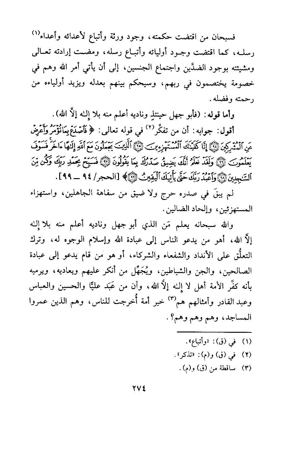 فسبحان من اقتضت حكمته، وجود ورثة وأتباع لأعدائه وأعداء (¬1) رسله، كما اقتضت وجود أوليائه وأتباع رسله، ومضت إرادته تعالى ومشيئته بوجود الضدين واجتماع الجنسين، إلى أن يأتي أمر الله وهم في خصومة يختصمون في ربهم، وسيحكم بينهم بعدله ويزيد أولياءه من رحمته وفضله.