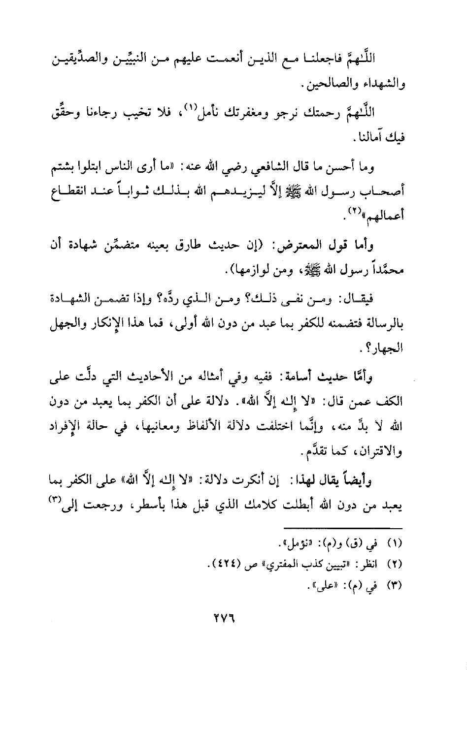 وأما حديث أسامة: ففيه وفي أمثاله من الأحاديث التي دلت على الكف عمن قال: "لا إله إلا الله ". دلالة على أن الكفر بما يعبد من دون الله لا بد منه، وإنما اختلفت دلالة الألفاظ ومعانيها، في حالة الأفراد والاقتران، كما تقدم.