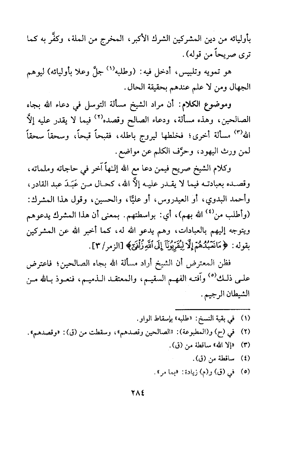 وكلام الشيخ صريح فيمن دعا مع الله إلها آخر في حاجاته وملماته، وقصده بعبادته فيما لا يقدر عليه إلا الله، كحال من عَبَدَ عبد القادر، وأحمد البدوي، أو العيدروس، أو عليًّا، والحسين، وقول هذا المشرك: (وأطلب من (¬4) الله بهم) ، أي: بواسطتهم. بمعنى أن هذا المشرك يدعوهم ويتوجه إليهم بالعبادات، وهم يدعو الله له، كما أخبر الله عن المشركين بقوله: {مَا نَعْبُدُهُمْ إِلَّا لِيُقَرِّبُونَا إِلَى اللَّهِ زُلْفَى} [الزمر: 3] [الزمر: 3] .