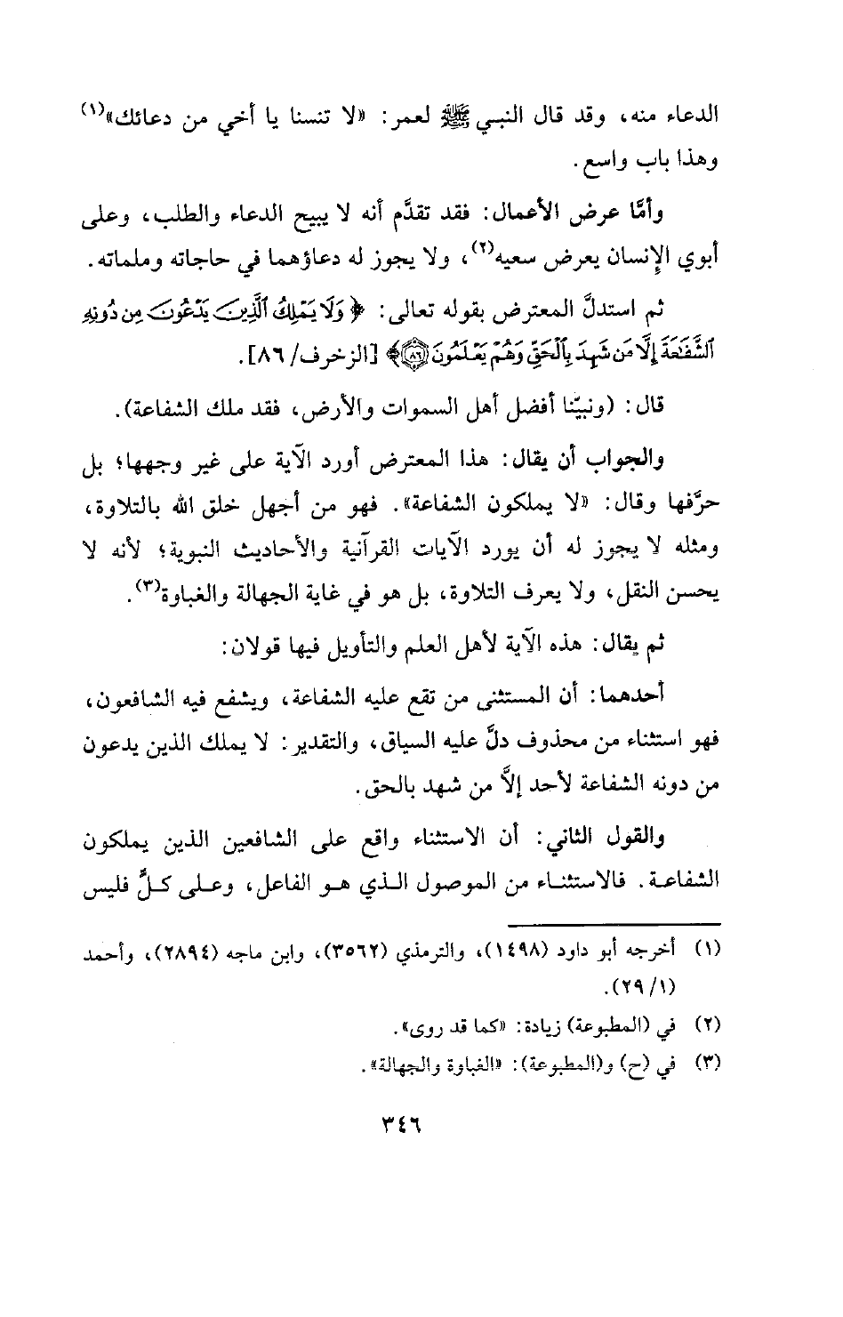 والجواب أن يقال: هذا المعترض أورد الآية على غير وجهها؛ بل حرَّفها وقال: "لا يملكون الشفاعة. فهو من أجهل خلق الله بالتلاوة، ومثله لا يجوز له أن يورد الآيات القرآنية والأحاديث النبوية؛ لأنه لا يحسن النقل، ولا يعرف التلاوة، بل هو في غاية الجهالة والغباوة (¬3) ثم يقال: هذه الآية لأهل العلم والتأويل فيها قولان: أحدهما: أن المستثنى من تقع عليه الشفاعة، ويشفع فيه الشافعون، فهو استثناء من محذوف دلَّ عليه السياق، والتقدير: لا يملك الذين يدعون من دونه الشفاعة لأحد إلاَّ من شهد بالحق.
