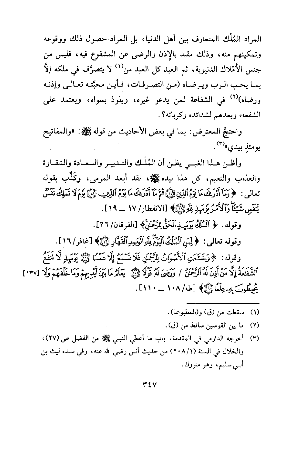 واحتجَّ المعترض: بما في بعض الأحاديث من قوله صلى الله عليه وسلم: " «والمفاتيح يومئذٍ بيدي» (¬3) . وأظن هذا الغبي يظن أن المُلْك والتدبير والسعادة والشقاوة والعذاب والنعيم، كل هذا بيده صلى الله عليه وسلم، لقد أبعد المرمى، وكَذَّب بقوله تعالى: {وَمَا أَدْرَاكَ مَا يَوْمُ الدِّينِ - ثُمَّ مَا أَدْرَاكَ مَا يَوْمُ الدِّينِ - يَوْمَ لَا تَمْلِكُ نَفْسٌ لِنَفْسٍ شَيْئًا وَالْأَمْرُ يَوْمَئِذٍ لِلَّهِ} [الانفطار: 17 - 19] [الانفطار 17 ـ 19]