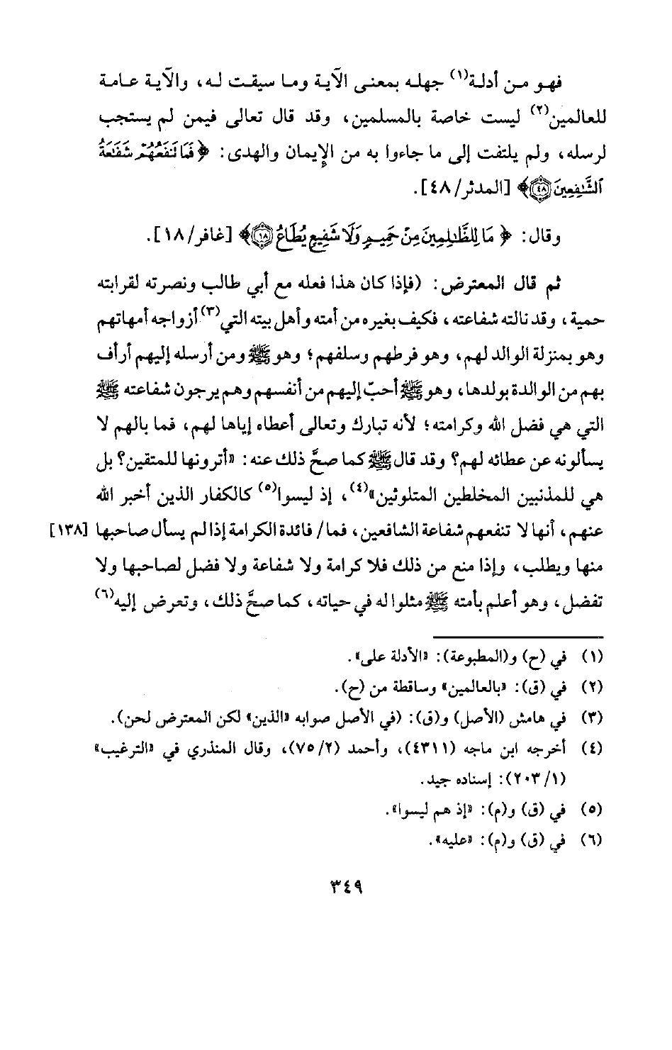 ثم قال المعترض: (فإذا كان هذا فعله مع أبي طالب ونصرته لقرابته حمية، وقد نالته شفاعته، فكيف بغيره من أمته وأهل بيته التي (¬3) أزواجه أمهاتهم وهو بمنزلة الوالد لهم، وهو فرطهم وسلفهم؟ وهو صلى الله عليه وسلم ومن أرسله إليهم أرأف بهم من الوالدة بولدها، وهو صلى الله عليه وسلم أحبّ إليهم من أنفسهم وهم يرجون شفاعته صلى الله عليه وسلم التي هي فضل الله وكرامته؟ لأنه تبارك وتعالى أعطاه إياها لهم، فما بالهم لا يسألونه عن عطائه لهم؟ وقد قال له كما صح ذلك عنه: «أترونها للمتقين؟ بل هي للمذنبين المخلطين المتلوثين» ) (¬4) إذ ليسوا (¬5) كالكفار الذين أخبر الله عنهم، أنها لا تنفعهم شفاعة الشافعين، فما فائدة الكرامة إذا لم يسأل صاحبها [138] ، منها ويطلب، وإذا منع من ذلك فلا كرامة ولا شفاعة ولا فضل لصاحبها ولا تفضل، وهو أعلم بأمته صلى الله عليه وسلم مثلوا له في حياته، كما صحَّ ذلك، وتعرض إليه (¬6)