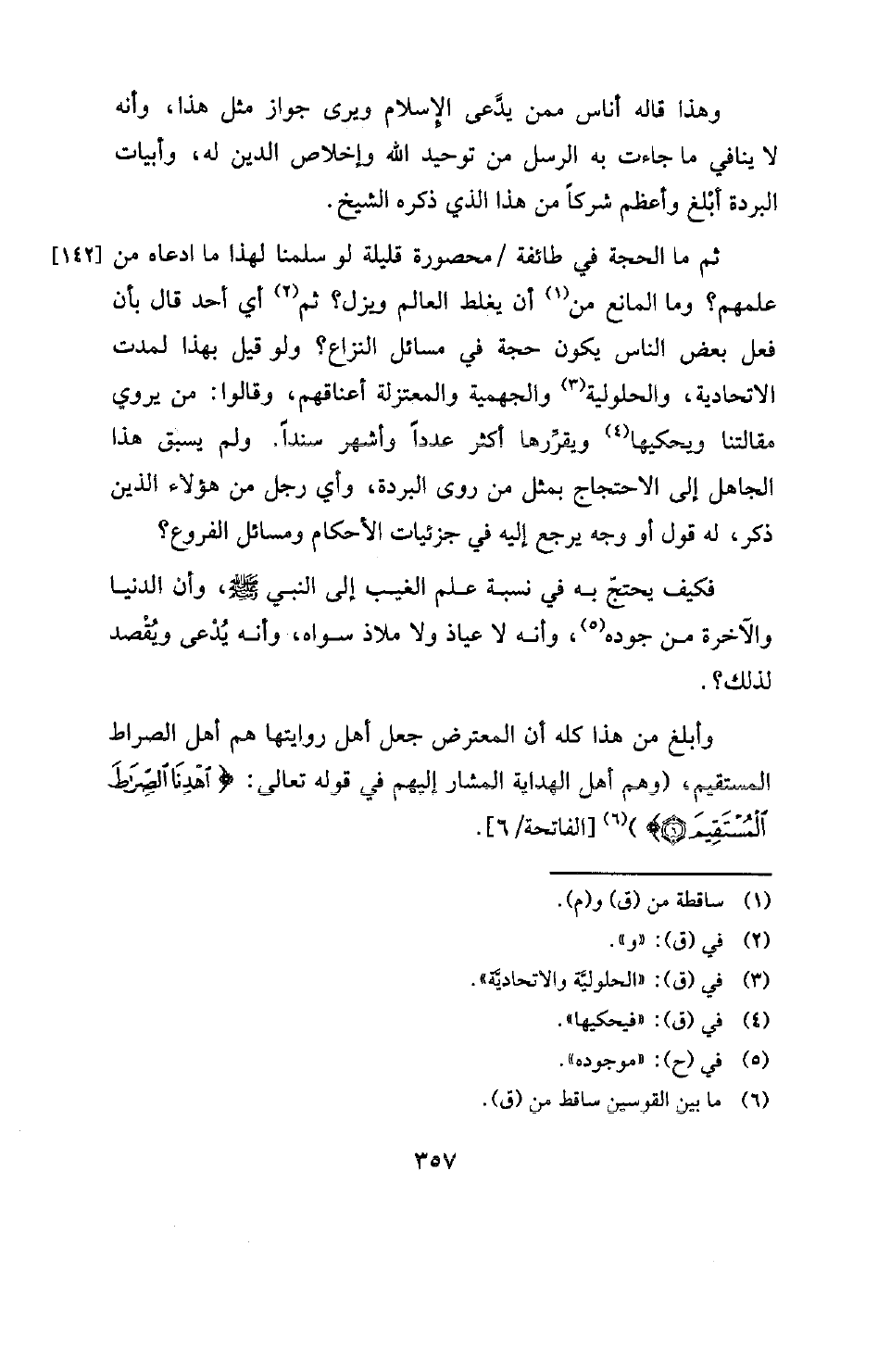 وأبلغ من هذا كله أن المعترض جعل أهل روايتها هم أهل الصراط المستقيم، (وهم أهل الهداية المشار إليهم في قوله تعالى: {اهْدِنَا الصِّرَاطَ الْمُسْتَقِيمَ} [الفاتحة: 6] [الفاتحة: 6] (¬6) .
