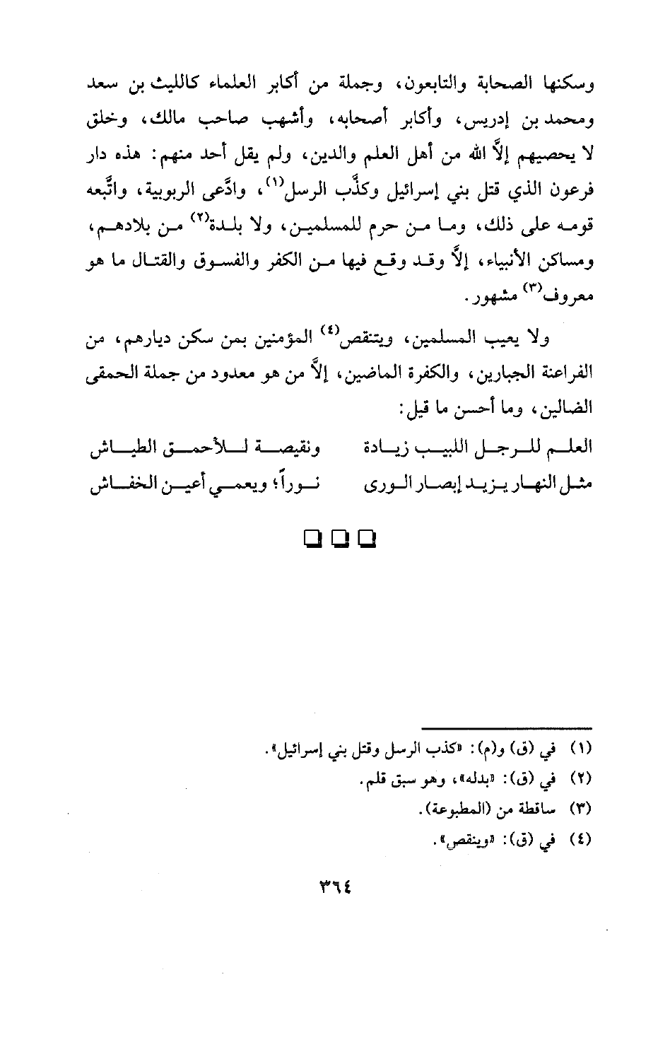 ولا يعيب المسلمين، ويتنقص (¬4) المؤمنين بمن سكن ديارهم، من الفراعنة الجبارين، والكفرة الماضين، إلاَّ من هو معدود من جملة الحمقى الضالين، وما أحسن ما قيل: