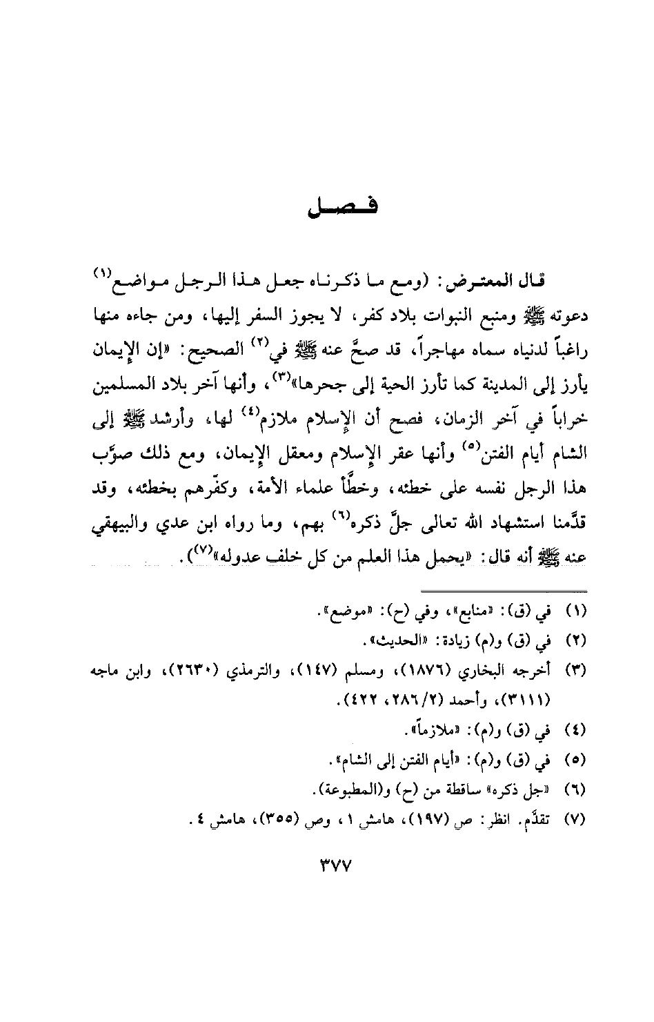 فصل قال المعترض: (ومع ما ذكرناه جعل هذا الرجل مواضع (¬1) . دعوته -صلى الله عليه وسلم- ومنبع النبوات بلاد كفر، لا يجوز السفر إليها، ومن جاءه منها راغبا لدنياه سماه مهاجرا، قد صحَّ عنه -صلى الله عليه وسلم- في (¬2) . الصحيح: " «إن الإيمان يأرز إلى المدينة كما تأرز الحية إلى جحرها» " (¬3) . وأنها آخر بلاد المسلمين خرابا في آخر الزمان، فصح أن الإسلام ملازم (¬4) . لها، وأرشد -صلى الله عليه وسلم- إلى الشام أيام الفتن (¬5) . وأنها عقر الإسلام ومعقل الإيمان، ومع ذلك صوب هذا الرجل نفسه على خطئه، وخطَّأ علماء الأمة، وكفّرهم بخطئه، وقد قدمنا استشهاد الله تعالى جلَّ ذكره (¬6) . بهم، وما رواه ابن عدي والبيهقي عنه -صلى الله عليه وسلم- أنه قال: " «يحمل هذا العلم من كل خلف عدوله» " (¬7) .