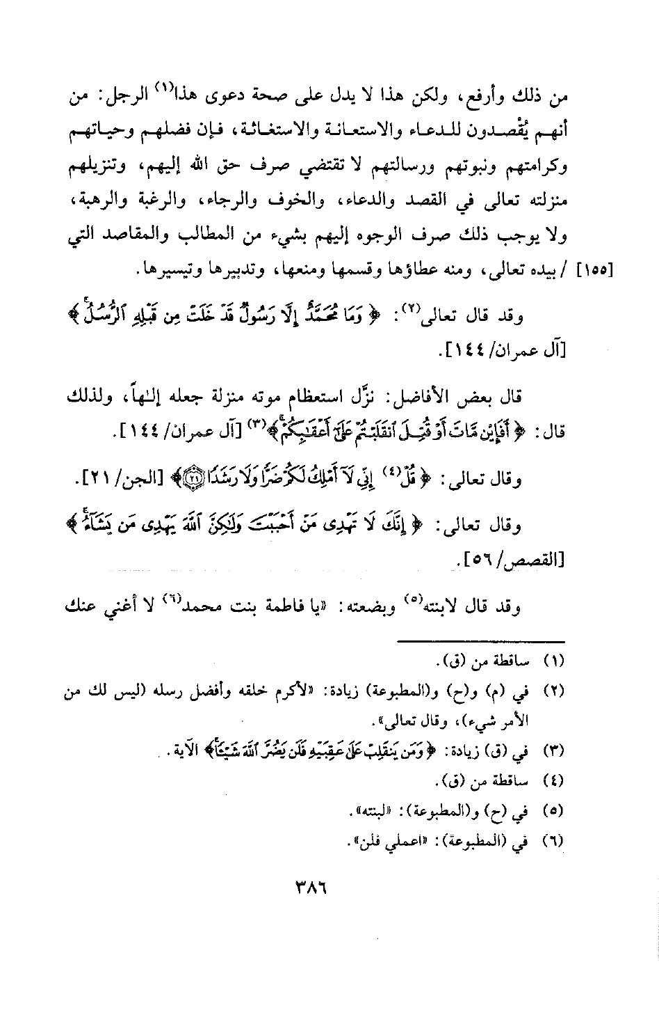 قال بعض الأفاضل: نزَّل استعظام موته منزلة جعله إلها، ولذلك قال: {أَفَإِنْ مَاتَ أَوْ قُتِلَ انْقَلَبْتُمْ عَلَى أَعْقَابِكُمْ} [آل عمران: 144] (¬3) [آل عمران -144] . وقال تعالى: {قُلْ (¬4) إِنِّي لَا أَمْلِكُ لَكُمْ ضَرًّا وَلَا رَشَدًا} [الجن: 21] [الجن -21] . وقال تعالى: {إِنَّكَ لَا تَهْدِي مَنْ أَحْبَبْتَ وَلَكِنَّ اللَّهَ يَهْدِي مَنْ يَشَاءُ} [القصص: 56] [القصص -56] .