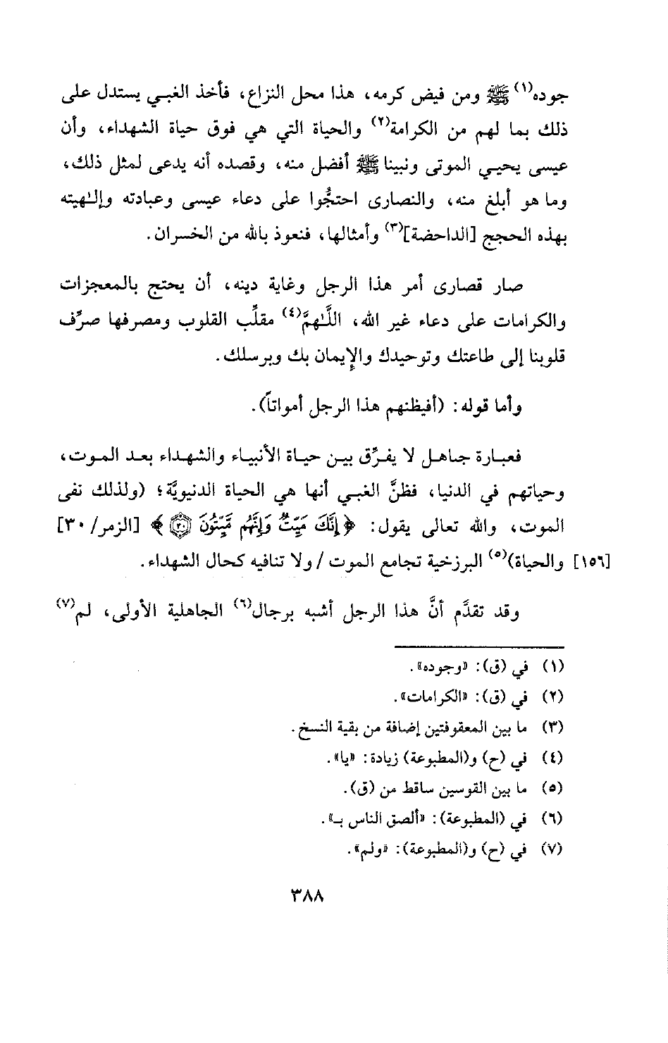 جوده (¬1) -صلى الله عليه وسلم- ومن فيض كرمه، هذا محل النزاع، فأخذ الغبي يستدل على ذلك بما لهم من الكرامة (¬2) والحياة التي هي فوق حياة الشهداء، وأن عيسى يحيي الموتى ونبينا -صلى الله عليه وسلم- أفضل منه، وقصده أنه يدعى لمثل ذلك، وما هو أبلغ منه، والنصارى احتجُّوا على دعاء عيسى وعبادته وإلهيته بهذه الحجج [الداحضة] (¬3) وأمثالها، فنعوذ بالله من الخسران.