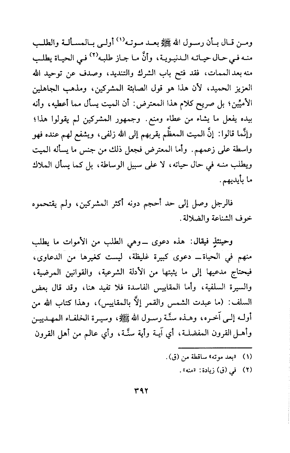 وحينئذٍ فيقال: هذه دعوى- وهي الطلب من الأموات ما يطلب منهم في الحياة- دعوى كبيرة غليظة، ليست كغيرها من الدعاوى، فيحتاج مدعيها إلى ما يثبتها من الأدلة الشرعية، والقوانين المرضية، والسيرة السلفية، وأما المقاييس الفاسدة فلا تفيد هنا، وقد قال بعض السلف: (ما عبدت الشمس والقمر إلا بالمقاييس) ، وهذا كتاب الله من أوله إلى آخره، وهذه سنَّة رسول الله -صلى الله عليه وسلم- وسيرة الخلفاء المهديين وأهل القرون المفضلة، أي آية وأية سنَّة، وأي عالم من أهل القرون