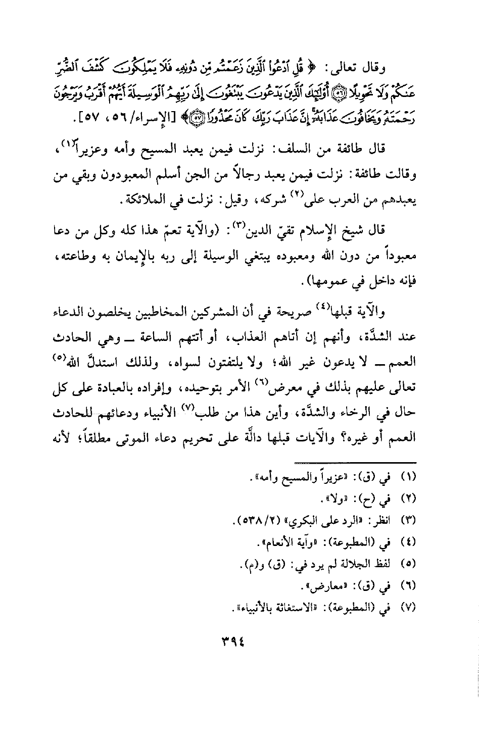 وقال تعالى: {قُلِ ادْعُوا الَّذِينَ زَعَمْتُمْ مِنْ دُونِهِ فَلَا يَمْلِكُونَ كَشْفَ الضُّرِّ عَنْكُمْ وَلَا تَحْوِيلًا - أُولَئِكَ الَّذِينَ يَدْعُونَ يَبْتَغُونَ إِلَى رَبِّهِمُ الْوَسِيلَةَ أَيُّهُمْ أَقْرَبُ وَيَرْجُونَ رَحْمَتَهُ وَيَخَافُونَ عَذَابَهُ إِنَّ عَذَابَ رَبِّكَ كَانَ مَحْذُورًا} [الإسراء: 56 - 57] [الإسراء -56، 57] .