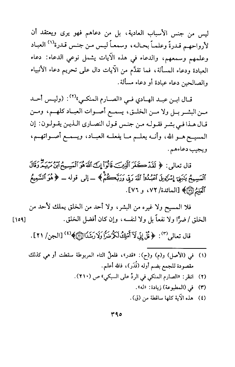 قال ابن عبد الهادي في "الصارم المنكي" (¬2) (وليس أحد من البشر بل ولا من الخلق، يسمع أصوات العباد كلهم، ومن قال هذا في بشر فقوله من جنس قول النصارى الذين يقولون: إن المسيح هو الله، وأنه يعلم ما يفعله العباد، ويسمع أصواتهم، ويجيب دعاءهم.