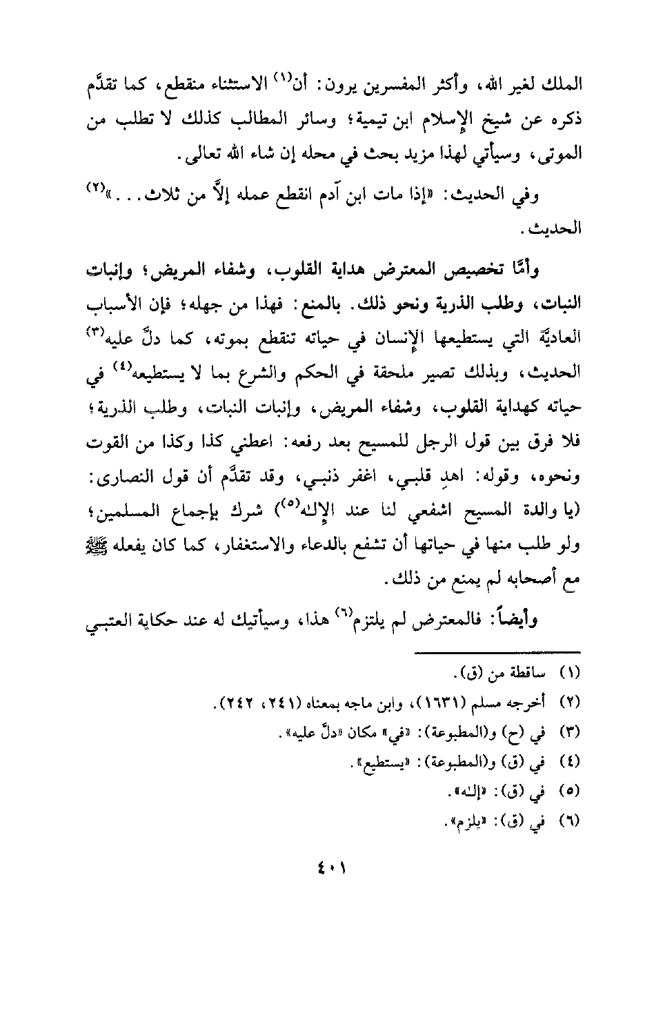 الملك لغير الله، وأكثر المفسرين يرون: أن (¬1) الاستثناء منقطع، كما تقدَّم ذكره عن شيخ الإسلام ابن تيمية؛ وسائر المطالب كذلك لا تطلب من الموتى، وسيأتي لهذا مزيد بحث في محله إن شاء الله تعالى. وفي الحديث: " «إذا مات ابن آدم انقطع عمله إلا من ثلاث» . . . " (¬2) وأمَّا تخصيص المعترض هداية القلوب، وشفاء المريض؛ وإنبات النبات، وطلب الذرية ونحو ذلك. بالمنع: فهذا من جهله؛ فإن الأسباب العادية التي يستطيعها الإنسان في حياته تنقطع بموته، كما دلَّ عليه (¬3) الحديث، وبذلك تصير ملحقة في الحكم والشرع بما لا يستطيعه (¬4) في حياته كهداية القلوب، وشفاء المريض، وإنبات النبات، وطلب الذرية؛ فلا فرق بين قول الرجل للمسيح بعد رفعه: اعطني كذا وكذا من القوت ونحوه، وقوله: اهدِ قلبي، اغفر ذنبي، وقد تقدَّم أن قول النصارى: (يا والدة المسيح اشفعي لنا عند الإله (¬5)) شرك بإجماع المسلمين؛ ولو طلب منها في حياتها أن تشفع بالدعاء والاستغفار، كما كان يفعله -صلى الله عليه وسلم- مع أصحابه لم يمنع من ذلك.