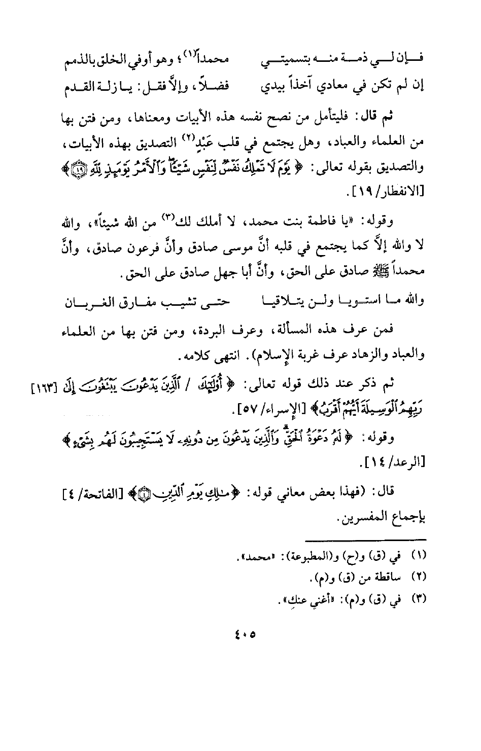 . فمن عرف هذه المسألة، وعرف البردة، ومن فتن بها من العلماء والعباد والزهاد عرف غربة الإسلام) . انتهى كلامه. ثم ذكر عند ذلك قوله تعالى: {أُولَئِكَ الَّذِينَ يَدْعُونَ يَبْتَغُونَ إِلَى رَبِّهِمُ الْوَسِيلَةَ أَيُّهُمْ أَقْرَبُ} [الإسراء: 57] [الإسراء -57] . وقوله: {لَهُ دَعْوَةُ الْحَقِّ وَالَّذِينَ يَدْعُونَ مِنْ دُونِهِ لَا يَسْتَجِيبُونَ لَهُمْ بِشَيْءٍ} [الرعد: 14] [الرعد -14] . قال: (فهذا بعض معاني قوله: {مَالِكِ يَوْمِ الدِّينِ} [الفاتحة: 4] [الفاتحة -4] بإجماع المفسرين.