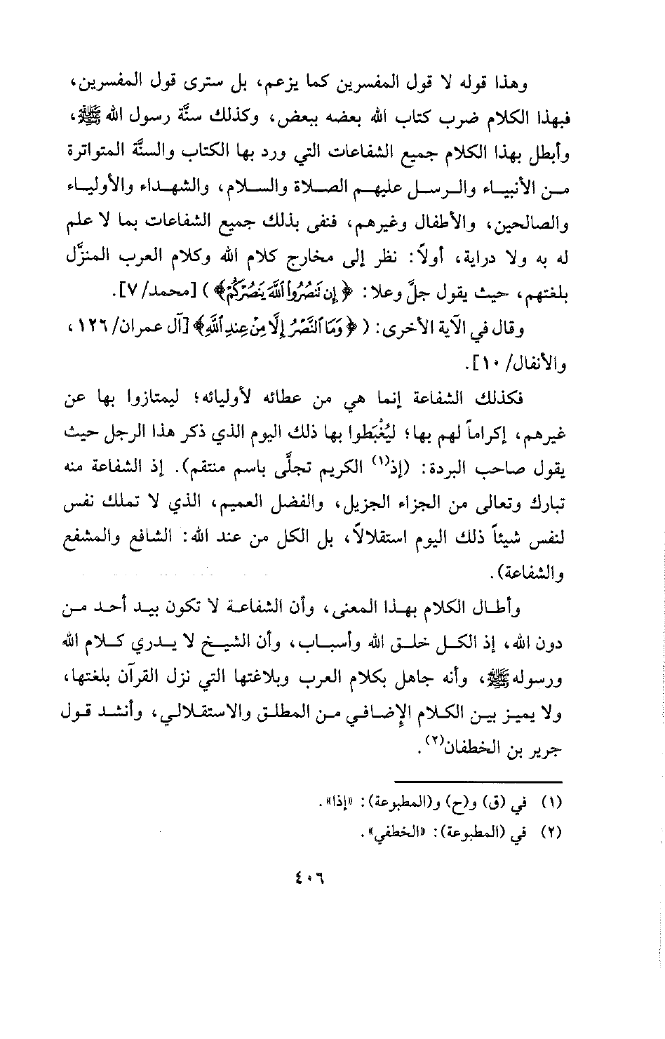 وهذا قوله لا قول المفسرين كما يزعم، بل سترى قول المفسرين، فبهذا الكلام ضرب كتاب الله بعضه ببعض، وكذلك سنَة رسول الله -صلى الله عليه وسلم- وأبطل بهذا الكلام جميع الشفاعات التي ورد بها الكتاب والسنَّة المتواترة من الأنبياء والرسل عليهم الصلاة والسلام، والشهداء والأولياء والصالحين، والأطفال وغيرهم، فنفى بذلك جميع الشفاعات بما لا علم له به ولا دراية، أولا: نظر إلى مخارج كلام الله وكلام العرب المنزَّل بلغتهم، حيث يقول جلَّ وعلا: {إِنْ تَنْصُرُوا اللَّهَ يَنْصُرْكُمْ} [محمد: 7] [محمد -7] . وقال في الآية الأخرى: {وَمَا النَّصْرُ إِلَّا مِنْ عِنْدِ اللَّهِ} [آل عمران: 126] [آل عمران -126، والأنفال -10] . فكذلك الشفاعة إنما هي من عطائه لأوليائه؛ ليمتازوا بها عن غيرهم، إكراما لهم بها؛ ليُغْبَطوا بها ذلك اليوم الذي ذكر هذا الرجل حيث يقول صاحب البردة: (إذ (¬1) الكريم تجلَّى باسم منتقم) . إذ الشفاعة منه تبارك وتعالى من الجزاء الجزيل، والفضل العميم، الذي لا تملك نفس لنفس شيئا ذلك اليوم استقلالا، بل الكل من عند الله: الشافع والمشفع والشفاعة) . وأطال الكلام بهذا المعنى، وأن الشفاعة لا تكون بيد أحد من دون الله، إذ الكل خلق الله وأسباب، وأن الشيخ لا يدري كلام الله ورسوله -صلى الله عليه وسلم- وأنه جاهل بكلام العرب وبلاغتها التي نزل القرآن بلغتها، ولا يميز بين الكلام الإضافي من المطلق والاستقلالي، وأنشد قول جرير بن الخطفان: (¬2) .
