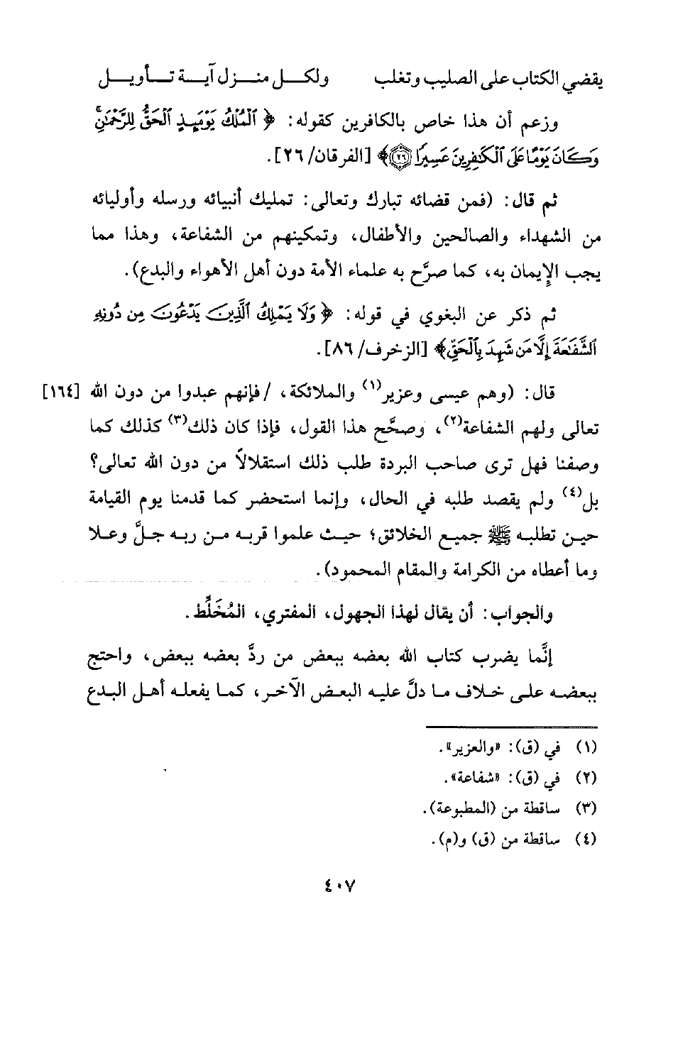. وزعم أن هذا خاص بالكافرين كقوله: {الْمُلْكُ يَوْمَئِذٍ الْحَقُّ لِلرَّحْمَنِ وَكَانَ يَوْمًا عَلَى الْكَافِرِينَ عَسِيرًا} [الفرقان: 26] [الفرقان -26] . ثم قال: (فمن قضائه تبارك وتعالى: تمليك أنبيائه ورسله وأوليائه من الشهداء والصالحين والأطفال، وتمكينهم من الشفاعة، وهذا مما يجب الإيمان به، كما صرَّح به علماء الأمة دون أهل الأهواء والبدع) . ثم ذكر عن البغوي في قوله: {وَلَا يَمْلِكُ الَّذِينَ يَدْعُونَ مِنْ دُونِهِ الشَّفَاعَةَ إِلَّا مَنْ شَهِدَ بِالْحَقِّ} [الزخرف: 86] [الزخرف / 86] . قال: (وهم عيسى وعزير (¬1) والملائكة، -فإنهم عبدوا من دون الله [164] تعالى ولهم الشفاعة (¬2) وصحَّح هذا القول، فإذا كان ذلك (¬3) كذلك كما وصفنا فهل ترى صاحب البردة طلب ذلك استقلالا من دون الله تعالى؟ بل (¬4) ولم يقصد طلبه في الحال، وإنما استحضر كما قدمنا يوم القيامة حين تطلبه -صلى الله عليه وسلم- جميع الخلائق؛ حيث علموا قربه من ربه جلَّ وعلا وما أعطاه من الكرامة والمقام المحمود) . والجواب: أن يقال لهذا الجهول، المفتري، المُخَلِّط. إنَما يضرب كتاب الله بعضه ببعض من ردَّ بعضه ببعض، واحتج ببعضه على خلاف ما دلَّ عليه البعض الآخر، كما يفعله أهل البدع