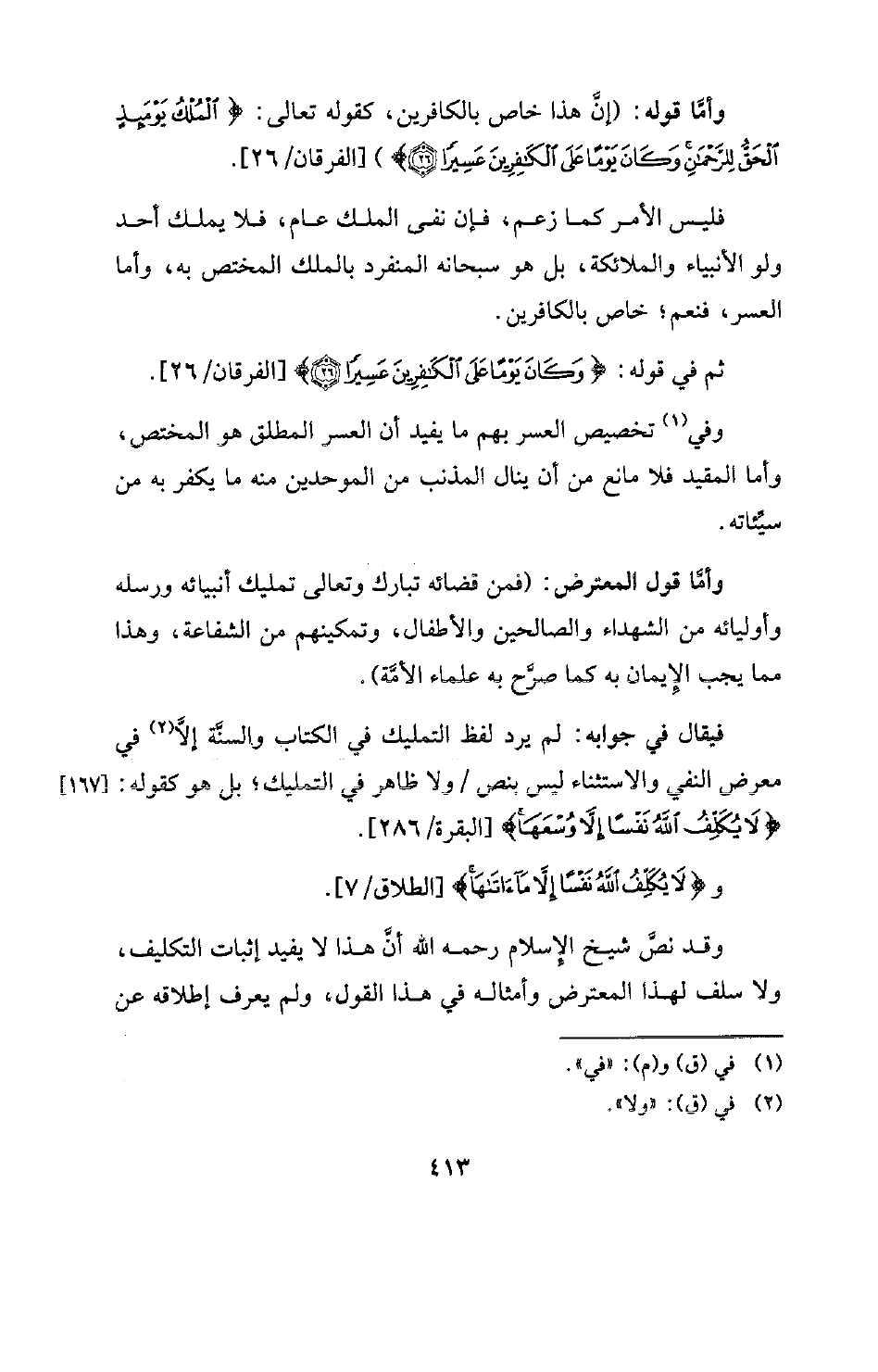 وأمَّا قوله: (إنَّ هذا خاص بالكافرين، كقوله تعالى: {الْمُلْكُ يَوْمَئِذٍ الْحَقُّ لِلرَّحْمَنِ وَكَانَ يَوْمًا عَلَى الْكَافِرِينَ عَسِيرًا} [الفرقان: 26] الفرقان -26] . فليس الأمر كما زعم، فإن نفي الملك عام، فلا يملك أحد ولو الأنبياء والملائكة، بل هو سبحانه المنفرد بالملك المختص به، وأما العسر، فنعم؟ خاص بالكافرين. ثم في قوله: {وَكَانَ يَوْمًا عَلَى الْكَافِرِينَ عَسِيرًا} [الفرقان: 26] الفرقان -26] . وفي (¬1) تخصيص العسر بهم ما يفيد أن العسر المطلق هو المختص، وأما المقيد فلا مانع من أن ينال المذنب من الموحدين منه ما يكفر به من سيئاته. وأما قول المعترض: (فمن قضائه تبارك وتعالى تمليك أنبيائه ورسله وأوليائه من الشهداء والصالحين والأطفال، وتمكينهم من الشفاعة، وهذا مما يجب الإيمان به كما صرَّح به علماء الأمة) . فيقال في جوابه: لم يرد لفظ التمليك في الكتاب والسنَّة إلا (¬2) في معرض النفي والاستثناء ليس بنص ولا ظاهر في التمليك؟ بل هو كقوله: [167] {لَا يُكَلِّفُ اللَّهُ نَفْسًا إِلَّا مَا آتَاهَا} [الطلاق: 7] وقد نصَّ شيخ الإسلام رحمه الله أنَّ هذا لا يفيد إثبات التكليف، ولا سلف لهذا المعترض وأمثاله في هذا القول، ولم يعرف إطلاقه عن