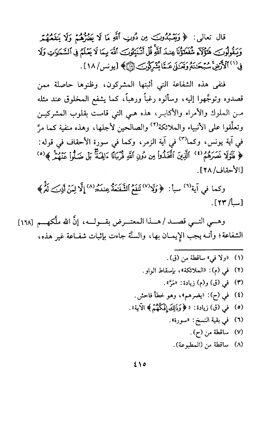 قال تعالى: {وَيَعْبُدُونَ مِنْ دُونِ اللَّهِ مَا لَا يَضُرُّهُمْ وَلَا يَنْفَعُهُمْ وَيَقُولُونَ هَؤُلَاءِ شُفَعَاؤُنَا عِنْدَ اللَّهِ قُلْ أَتُنَبِّئُونَ اللَّهَ بِمَا لَا يَعْلَمُ فِي السَّمَاوَاتِ وَلَا فِي (¬1) الْأَرْضِ سُبْحَانَهُ وَتَعَالَى عَمَّا يُشْرِكُونَ} [يونس: 18] [يونس: 18] . فنفى هذه الشفاعة التي أثبتها المشركون، وظنوها حاصلة ممن قصدوه وتوجَّهوا إليه، وسألوه رغبا ورهبا، كما يشفع المخلوق عند مثله من الملوك والأمراء والأكابر، هذه هي التي قامت بقلوب المشركين وتعلقوا على الأنبياء والملائكة (¬2) والصالحين لأجلها، وهذه منفية كما مرَّ في آية يونس، وكما (¬3) في آية الزمر، وكما في سورة الأحقاف في قوله: {فَلَوْلَا نَصَرَهُمُ (¬4) الَّذِينَ اتَّخَذُوا مِنْ دُونِ اللَّهِ قُرْبَانًا آلِهَةً بَلْ ضَلُّوا عَنْهُمْ} [الأحقاف: 28] ) (¬5) [الأحقاف - 18 - 28] . وكما في آية (¬6) سبأ: ( {وَلَا (¬7) تَنْفَعُ الشَّفَاعَةُ عِنْدَهُ (¬8) إِلَّا لِمَنْ أَذِنَ لَهُ} [سبأ: 23] ) [سبأ: 23] . وهي التي قصد هذا المعترض بقوله، إنَّ الله ملَّكهم [168] الشفاعة؟ وأنه يجب الإيمان بها، والسنَّة جاءت بإثبات شفاعة غير هذه،