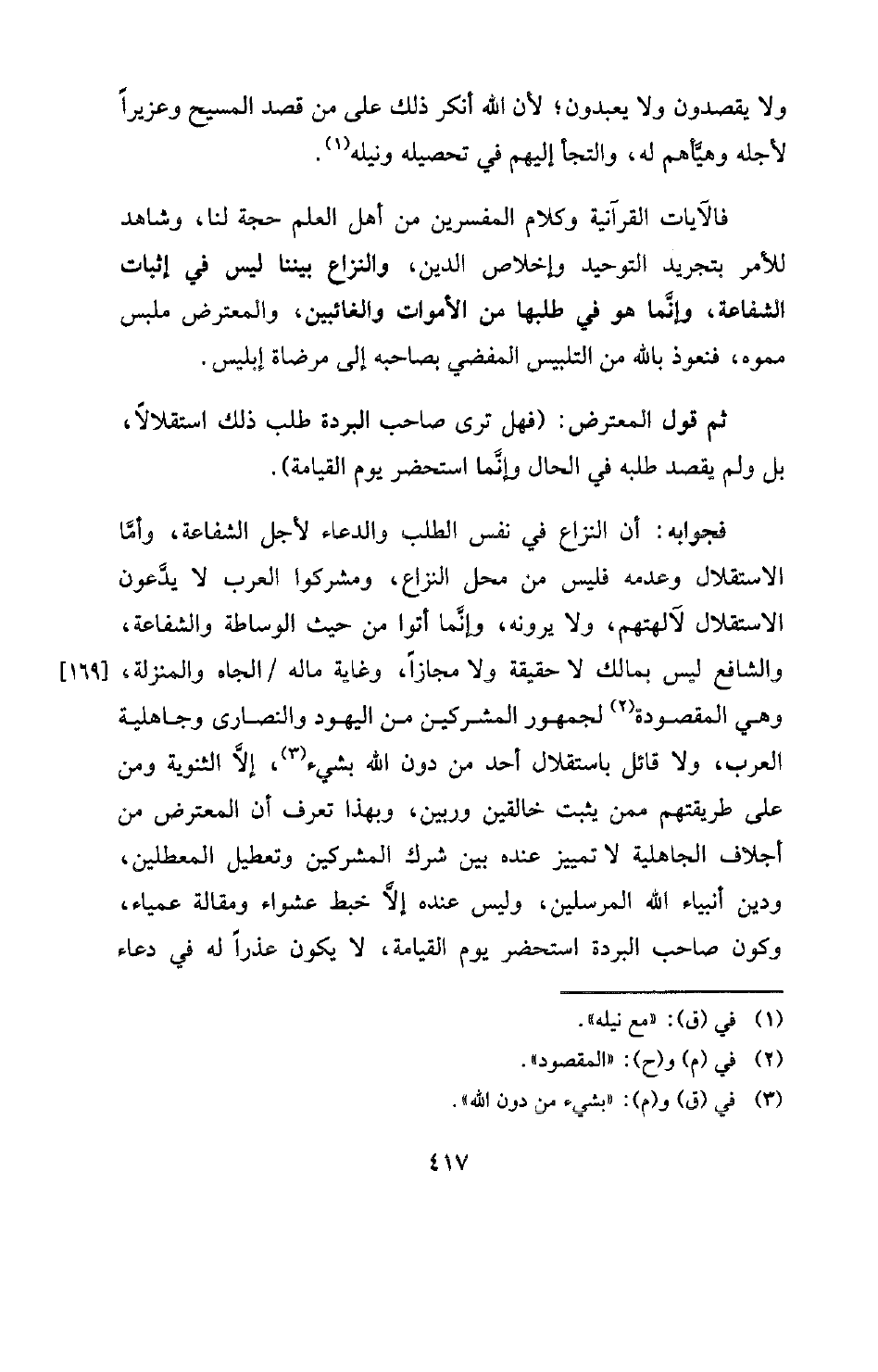 ولا يقصدون ولا يعبدون؟ لأن الله أنكر ذلك على من قصد المسيح وعزيرا لأجله وهيَّأهم له، والتجأ إليهم في تحصيله ونيله (¬1) . فالآيات القرآنية وكلام المفسرين من أهل العلم حجة لنا، وشاهد للأمر بتجريد التوحيد وإخلاص الدين، والنزاع بيننا ليس في إثبات الشفاعة، وإنما هو في طلبها من الأموات والغائبين، والمعترض ملبس مموه، فنعوذ بالله من التلبيس المفضي بصاحبه إلى مرضاة إبليس. ثم قول المعترض: (فهل ترى صاحب البردة طلب ذلك استقلالا، بل ولم يقصد طلبه في الحال دائما استحضر يوم القيامة) . فجوابه: أن النزاع في نفس الطلب والدعاء لأجل الشفاعة، وأمَّا الاستقلال وعدمه فليس من محل النزاع، ومشركو العرب لا يدَّعون الاستقلال لآلهتهم، ولا يرونه، وإنما أتوا من حيث الوساطة والشفاعة، والشافع ليس بمالك لا حقيقة ولا مجازا، وغاية ماله الجاه والمنزلة، [169] ، وهي المقصودة (¬2) لجمهور المشركين من اليهود والنصارى وجاهلية العرب. ولا قائل باستقلال أحد من دون الله بشيء (¬3) إلا الثنوية ومن على طريقتهم ممن يثبت خالقين وربين، وبهذا تعرف أن المعترض من أجلاف الجاهلية لا تمييز عنده بين شرك المشركين وتعطيل المعطلين، ودين أنبياء الله المرسلين، وليس عنده إلا خبط عشواء ومقالة عمياء، وكون صاحب البردة استحضر يوم القيامة، لا يكون عذرا له في دعاء