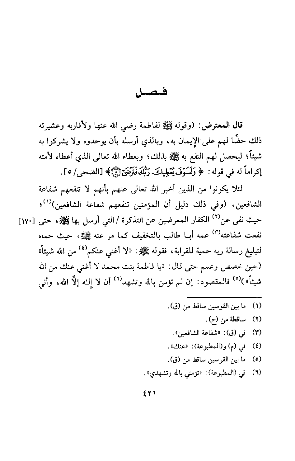 فصل قال المعترض: (وقوله -صلى الله عليه وسلم- لفاطمة رضي الله عنها ولأقاربه وعشيرته ذلك حضًّا لهم على الإيمان به، وبالذي أرسله بأن يوحدوه ولا يشركوا به شيئا؟ ليحصل لهم النفع به -صلى الله عليه وسلم- بذلك؟ وبعطاء الله تعالى الذي أعطاه لأمته إكراما له في قوله: {وَلَسَوْفَ يُعْطِيكَ رَبُّكَ فَتَرْضَى} [الضحى: 5] [الضحى / 5] . لئلا يكونوا من الذين أخبر الله تعالى عنهم بأنهم لا تنفعهم شفاعة الشافعين، (وفي ذلك دليل أن المؤمنين تنفعهم شفاعة الشافعين) (¬1) ؟ حيث نفى عن (¬2) الكفار المعرضين عن التذكرة التي أرسل بها -صلى الله عليه وسلم- حتي نفعت شفاعته (¬3) عمه أبا طالب بالتخفيف كما مر عنه -صلى الله عليه وسلم-، حيث حماه لتبليغ رسالة ربه حمية للقرابة، فقوله -صلى الله عليه وسلم-: " «لا أغني عنكم (¬4) من الله شيئا» " (حين خصص وعمم حتى قال: " «يا فاطمة بنت محمد لا أغني عنك من الله شيئا» ") (¬5) فالمقصود: إن لم تؤمن بالله وتشهد (¬6) أن لا إِله إلا الله، وأني