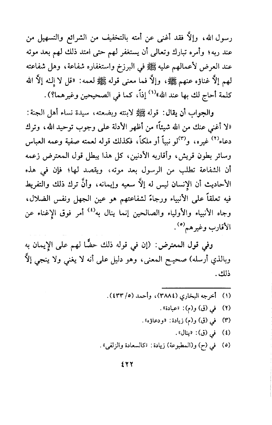 والجواب أن يقال: قوله -صلى الله عليه وسلم- لابنته وبضعته، سيدة نساء أهل الجنة: " «لا أغني عنك من الله شيئا» " من أظهر الأدلة على وجوب توحيد الله، وترك دعاء (¬2) غيره، و (¬3) لو نبيا أو ملكا، فكذلك قوله لعمته صفية وعمه العباس وسائر بطون قريش، وأقاربه الأدنين، كل هذا يبطل قول المعترض زعمه أن الشفاعة تطلب من الرسول بعد موته، ويقصد لها؟ .
