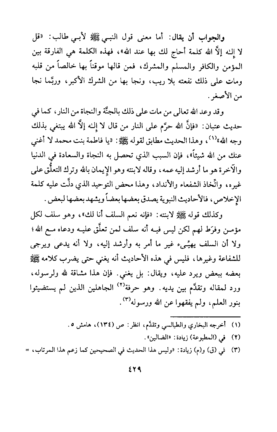 وقد وعد الله تعالى من مات على ذلك بالجنَّة والنجاة من النار، كما في حديث عتبان: " «فإن الله حرَّم على النار من قال لا إِله إلا الله يبتغي بذلك وجه الله» " (¬1) وهذا الحديث مطابق لقوله -صلى الله عليه وسلم-: " «يا فاطمة بنت محمد لا أغني عنك من الله شيئا» "، فإن السبب الذي تحصل به النجاة والسعادة في الدنيا والآخرة هو ما أرشد إليه عمه، وقاله لابنته وهو الإيمان بالله وترك التعلُق على غيره، واتّخاذ الشفعاء والأنداد، وهذا محض التوحيد الذي دلَّت عليه كلمة الإخلاص، فالأحاديث النبوية يصدق بعضها بعضا ويشهد بعضها لبعض.
