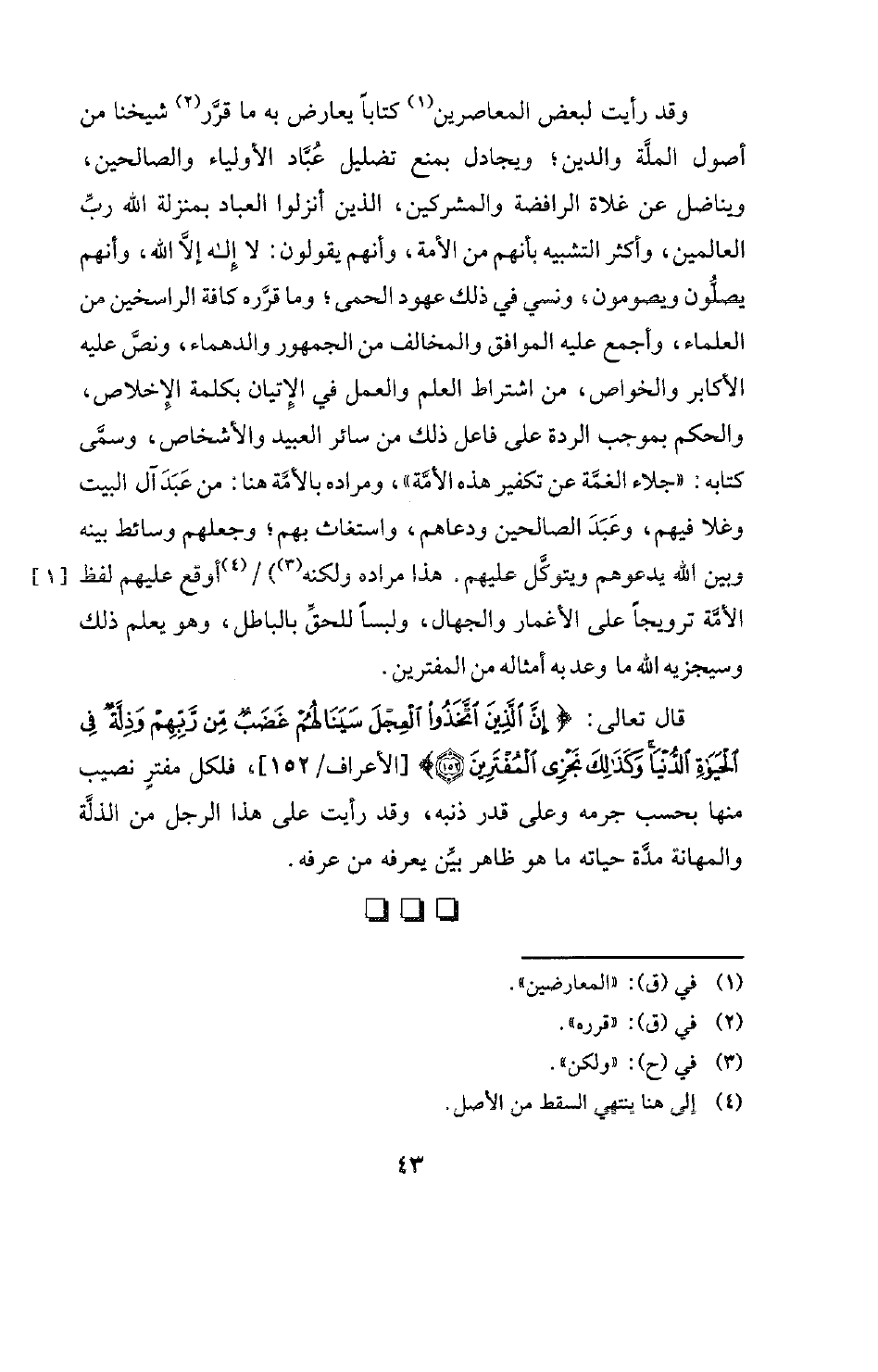 وقد رأيت لبعض المعاصرين (¬1) كتابًا يعارض به ما قرَّر (¬2) شيخنا من أصول الملَّة والدين؛ ويجادل بمنع تضليل عُبَّاد الأولياء والصالحين، ويناضل عن غلاة الرافضة والمشركين، الذين أنزلوا العباد بمنزلة الله ربِّ العالمين، وأكثر التشبيه بأنهم من الأمة، وأنهم يقولون: لا إِله إلا الله، وأنهم يصلُّون ويصومون، ونسي في ذلك عهود الحمى؛ وما قرَّره كافة الراسخين من العلماء، وأجمع عليه الموافق والمخالف من الجمهور والدهماء، ونصَّ محليه الأكابر والخواص، من اشتراط العلم والعمل في الإتيان بكلمة الإخلاص، والحكم بموجب الردة على فاعل ذلك من سائر العبيد والأشخاص، وسمَّى كتابه: " جلاء الغمَّة عن تكفير هذه الأمَّة "، ومراده بالأمَّة هنا: من عَبَدَ آل البيت وغلا فيهم، وعَبَدَ الصالحين ودعاهم، واستغاث بهم؛ وجعلهم وسائط بينه وبين الله يدعوهم ويتوكَّل عليهم. هذا مراده ولكنه (¬3) (¬4) أوقع عليهم لفظ الأمَّة ترويجًا على الأعمار والجهال، ولبسًا للحقِّ بالباطل، وهو يعلم ذلك وسيجزيه الله ما وعد به أمثاله من المفترين.
