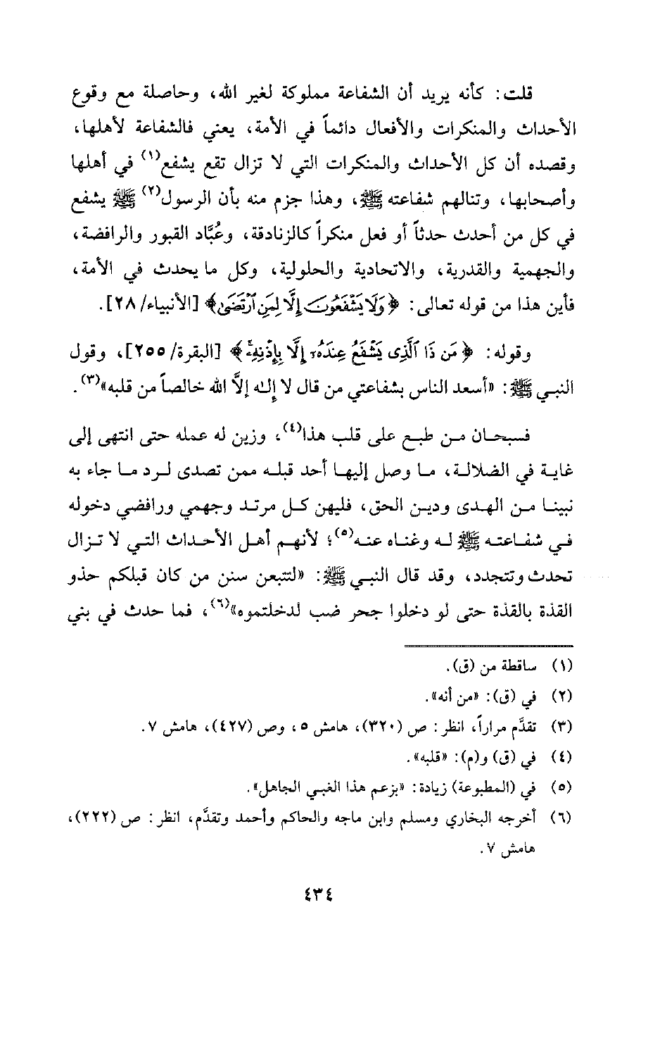 قلت: كأنه يريد أن الشفاعة مملوكة لغير الله، وحاصلة مع وقوع الأحداث والمنكرات والأفعال دائما في الأمة، يعني فالشفاعة لأهلها، وقصده أن كل الأحداث والمنكرات التي لا تزال تقع يشفع (¬1) في أهلها وأصحابها، وتنالهم شفاعته -صلى الله عليه وسلم- وهذا جزم منه بأن الرسول (¬2) -صلى الله عليه وسلم- يشفع في كل من أحدث حدثا أو فعل منكرا كالزنادقة، وعُبَّاد القبور والرافضة، والجهيمة والقدرية، والاتحادية والحلولية، وكل ما يحدث في الأمة، فأين هذا من قوله تعالى: {وَلَا يَشْفَعُونَ إِلَّا لِمَنِ ارْتَضَى} [الأنبياء: 28] [الأنبياء -28] .