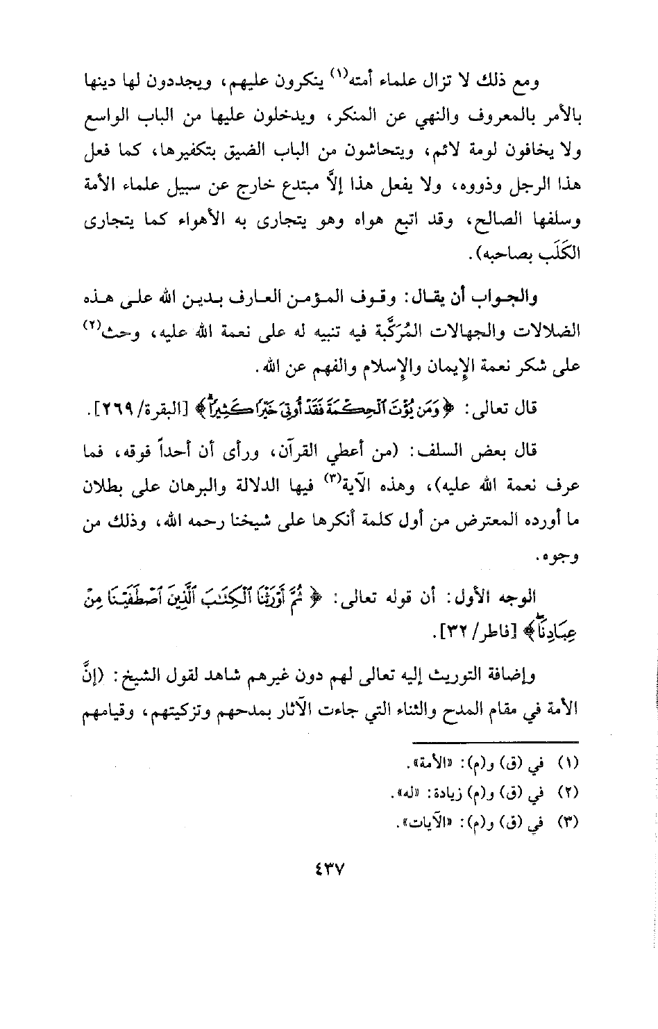 الوجه الأول: أن قوله تعالى: {ثُمَّ أَوْرَثْنَا الْكِتَابَ الَّذِينَ اصْطَفَيْنَا مِنْ عِبَادِنَا} [فاطر: 32] [فاطر / 32] . وإضافة التوريث إليه تعالى لهم دون غيرهم شاهد لقول الشيخ: (إنَّ الأمة في مقام المدح والثناء التي جاءت الآثار بمدحهم وتزكيتهم، وقيامهم