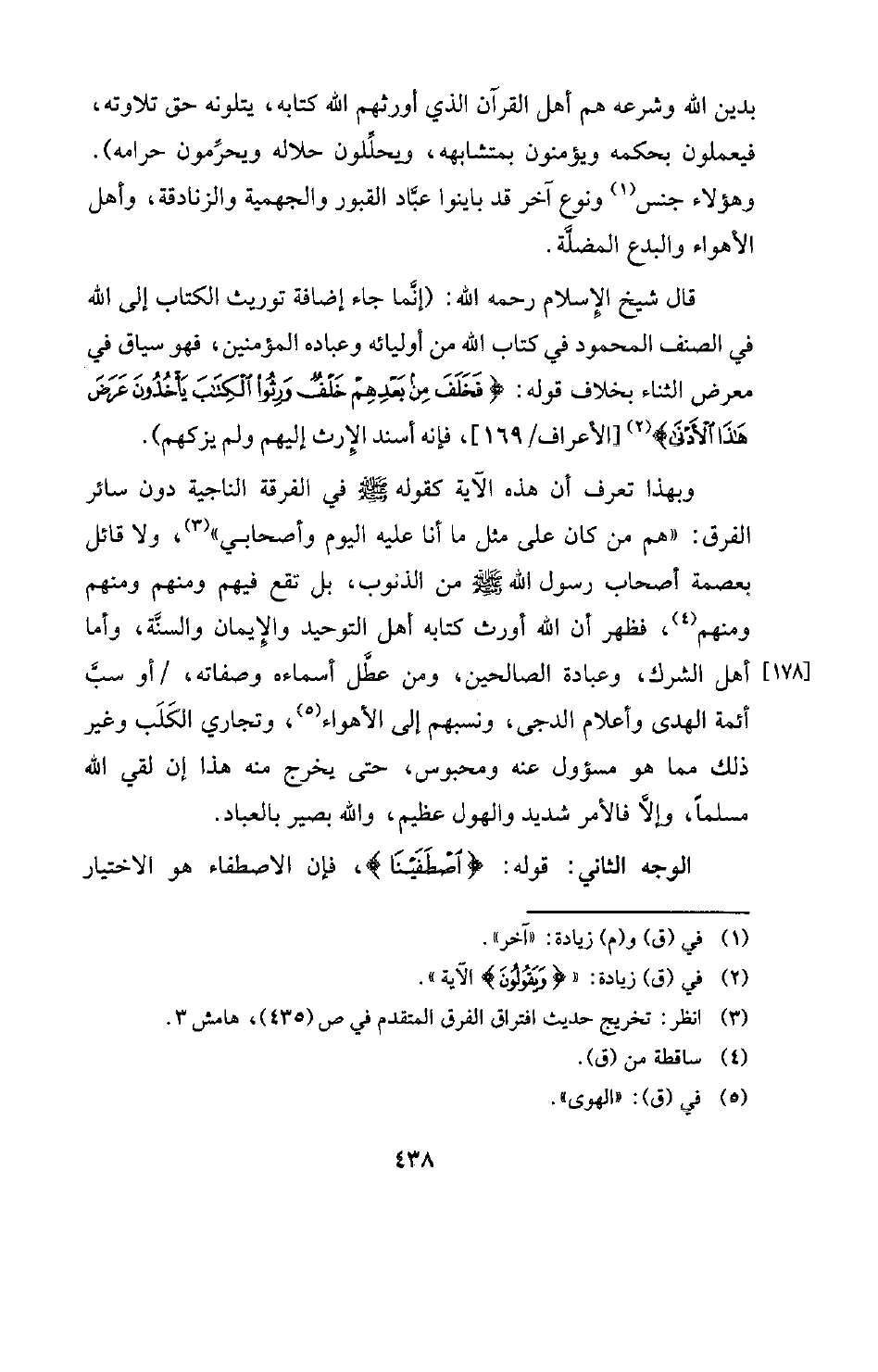 قال شيخ الإسلام رحمه الله: (إنَّما جاء إضافة توريث الكتاب إلى الله في الصنف المحمود في كتاب الله من أوليائه وعباده المؤمنين، فهو سياق في معرض الثناء بخلاف قوله: {فَخَلَفَ مِنْ بَعْدِهِمْ خَلْفٌ وَرِثُوا الْكِتَابَ يَأْخُذُونَ عَرَضَ هَذَا الْأَدْنَى} [الأعراف: 169] (¬2) [الأعراف -169] . فإنه أسند الإرث إليهم ولم يزكهم) . وبهذا تعرف أن هذه الآية كقوله -صلى الله عليه وسلم- في الفرقة الناجية دون سائر الفرق: " «هم من كان على مثل ما أنا عليه اليوم وأصحابي» (¬3) ولا قائل بعصمة أصحاب رسول الله -صلى الله عليه وسلم- من الذنوب، بل تقع فيهم ومنهم ومنهم ومنهم (¬4) فظهر أن الله أورث كتابه أهل التوحيد والإيمان والسنَّة، وأما، أهل الشرك، وعبادة الصالحين، ومن عطَّل أسماءه وصفاته، أو سبَّ أئمة الهدى وأعلام الدجى، ونسبهم إلى الأهواء (¬5) وتجاري الكلب وغير ذلك مما هو مسؤول عنه ومحبوس، حتى يخرج منه هذا إن لقي الله مسلما، وإلا فالأمر شديد والهول عظيم، والله بصير بالعباد.