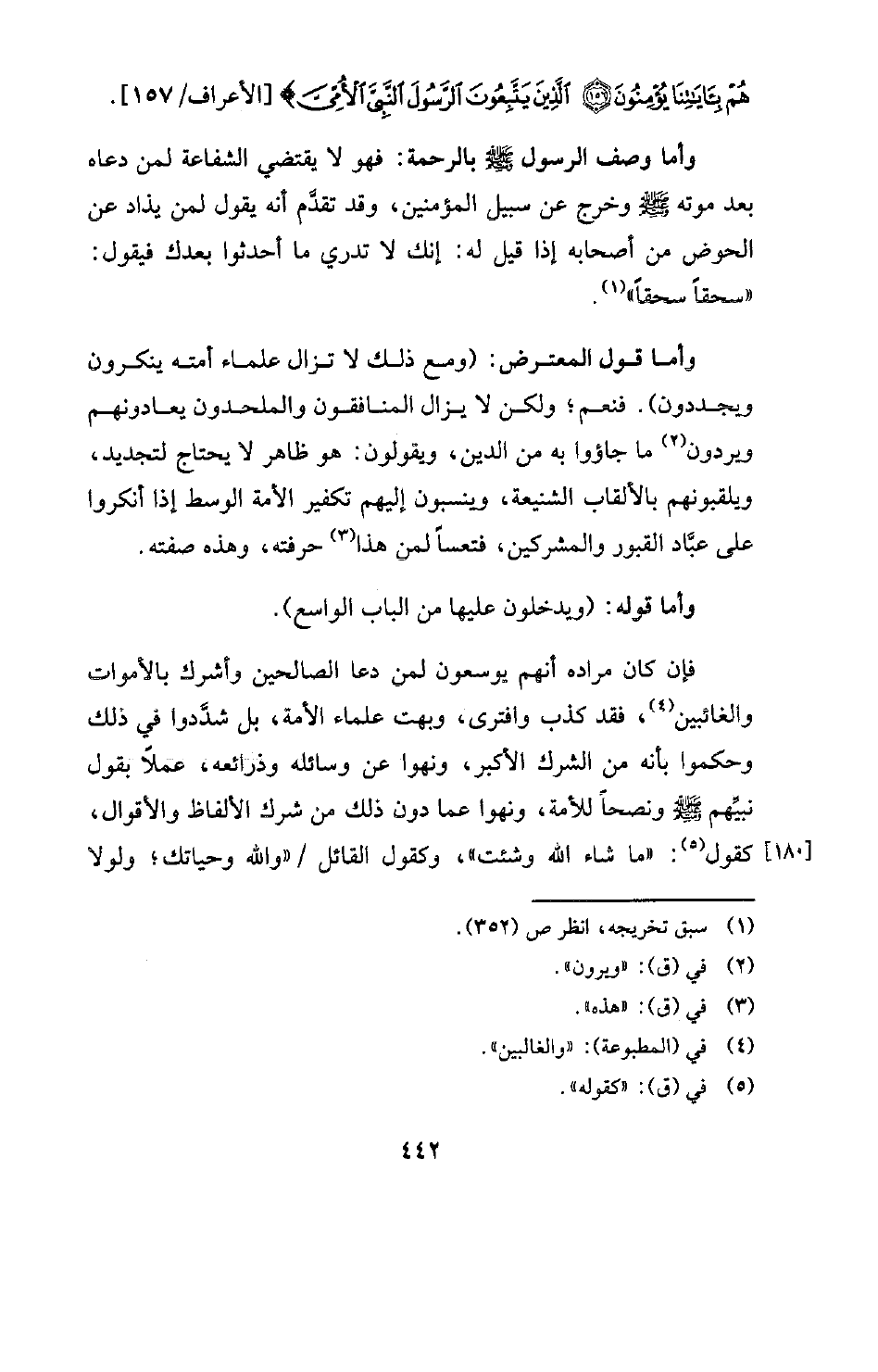 وأما وصف الرسول -صلى الله عليه وسلم- بالرحمة: فهو لا يقضي الشفاعة لمن دعاه بعد موته -صلى الله عليه وسلم- وخرج عن سبيل المؤمنين، وقد تقدَّم أنه يقول لمن يذاد عن الحوض من أصحابه إذا قيل له: إنك لا تدري ما أحدثوا بعدك فيقول: " سحقا سحقا " (¬1) .