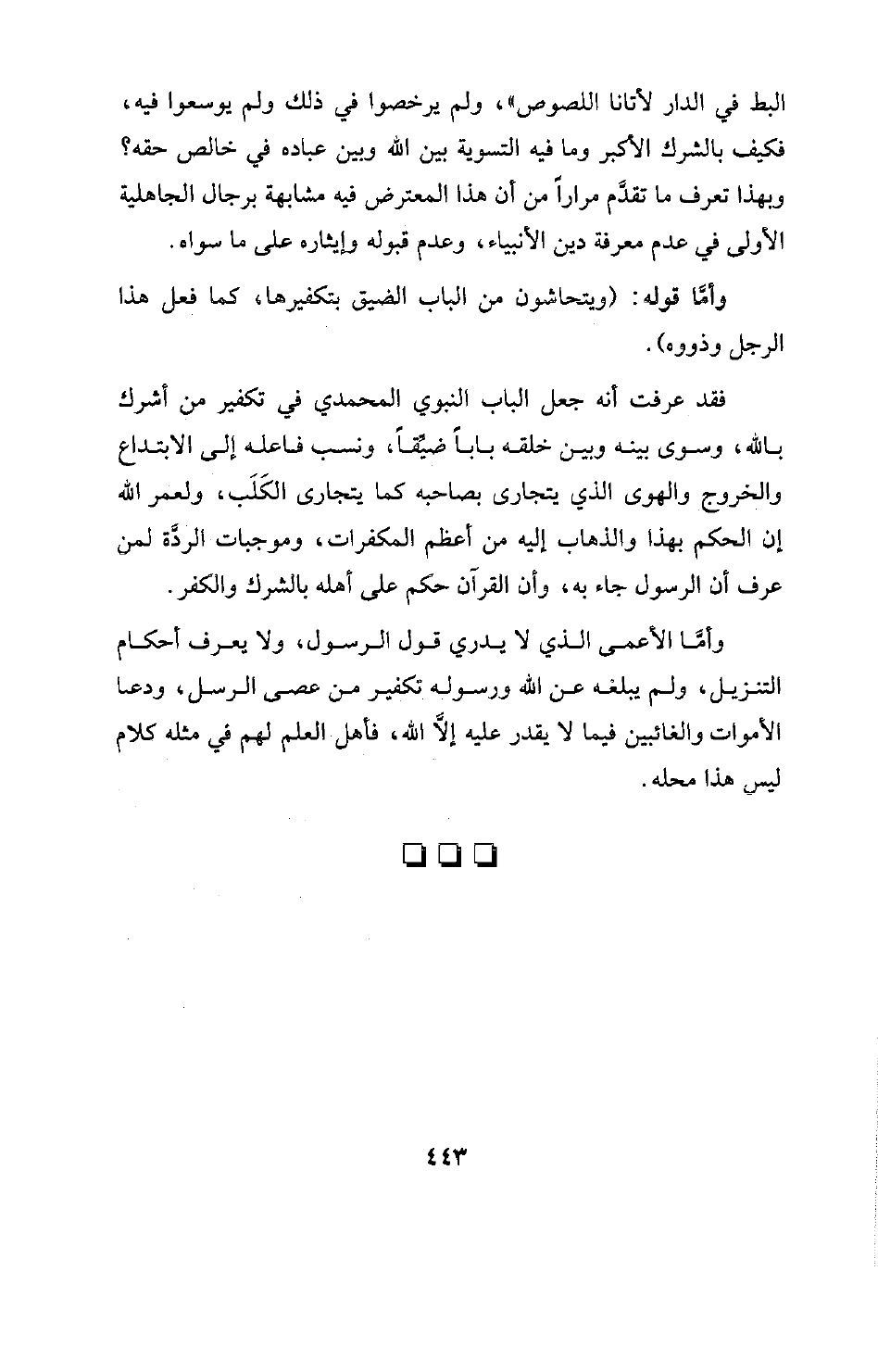 وأمَّا قوله: (ويتحاشون من الباب الضيق بتكفيرها، كما فعل هذا الرجل وذووه) . فقد عرفت أنه جعل الباب النبوي المحمدي في تكفير من أشرك بالله، وسوى بينه وبين خلقه بابا ضيّقا، ونسب فاعله إلى الابتداع والخروج والهوى الذي يتجارى بصاحبه كما يتجارى الكلب، ولعمر الله إن الحكم بهذا والذهاب إليه من أعظم المكفرات، وموجبات الردَّة لمن عرف أن الرسول جاء به، وأن القرآن حكم على أهله بالشرك والكفر. وأما الأعمى الذي لا يدري قول الرسول، ولا يعرف أحكام التنزيل، ولم يبلغه عن الله ورسوله تكفير من عصى الرسل، ودعا الأموات والغائبين فيما لا يقدر عليه إلا الله، فأهل العلم لهم في مثله كلام ليس هذا محله.
