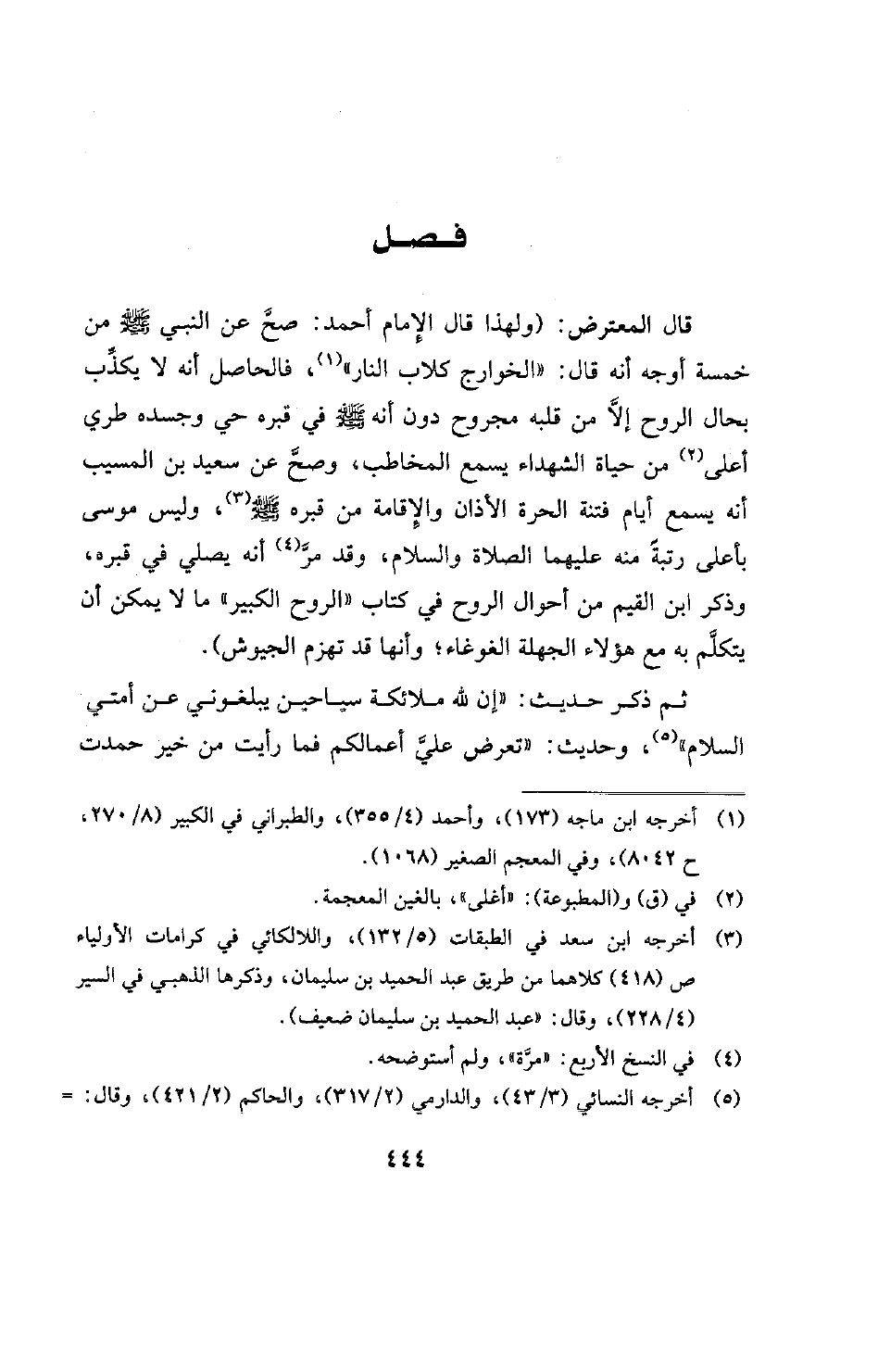 فصل قال المعترض: (ولهذا قال الإمام أحمد: صحَّ عن النبي -صلى الله عليه وسلم- من خمسة أوجه أنه قال: " «الخوارج كلاب النار» " (¬1) فالحاصل أنه لا يكذّب بحال الروح إلا من قلبه مجروح دون أنه -صلى الله عليه وسلم- في قبره حي وجسده طري أعلى (¬2) من حياة الشهداء يسمع المخاطب، وصح عن سعيد بن المسيب أنه يسمع أيام فتنة الحرة الأذان والإقامة من قبره -صلى الله عليه وسلم- (¬3) وليس موسى بأعلى رتبة منه -عليهما الصلاة والسلام-، وقد مرَّ (¬4) أنه يصلي في قبره، وذكر ابن القيم من أحوال الروح في كتاب " الروح الكبير" ما لا يمكن أن يتكلَّم به مع هؤلاء الجهلة الغوغاء؛ وأنها قد تهزم الجيوش) .
