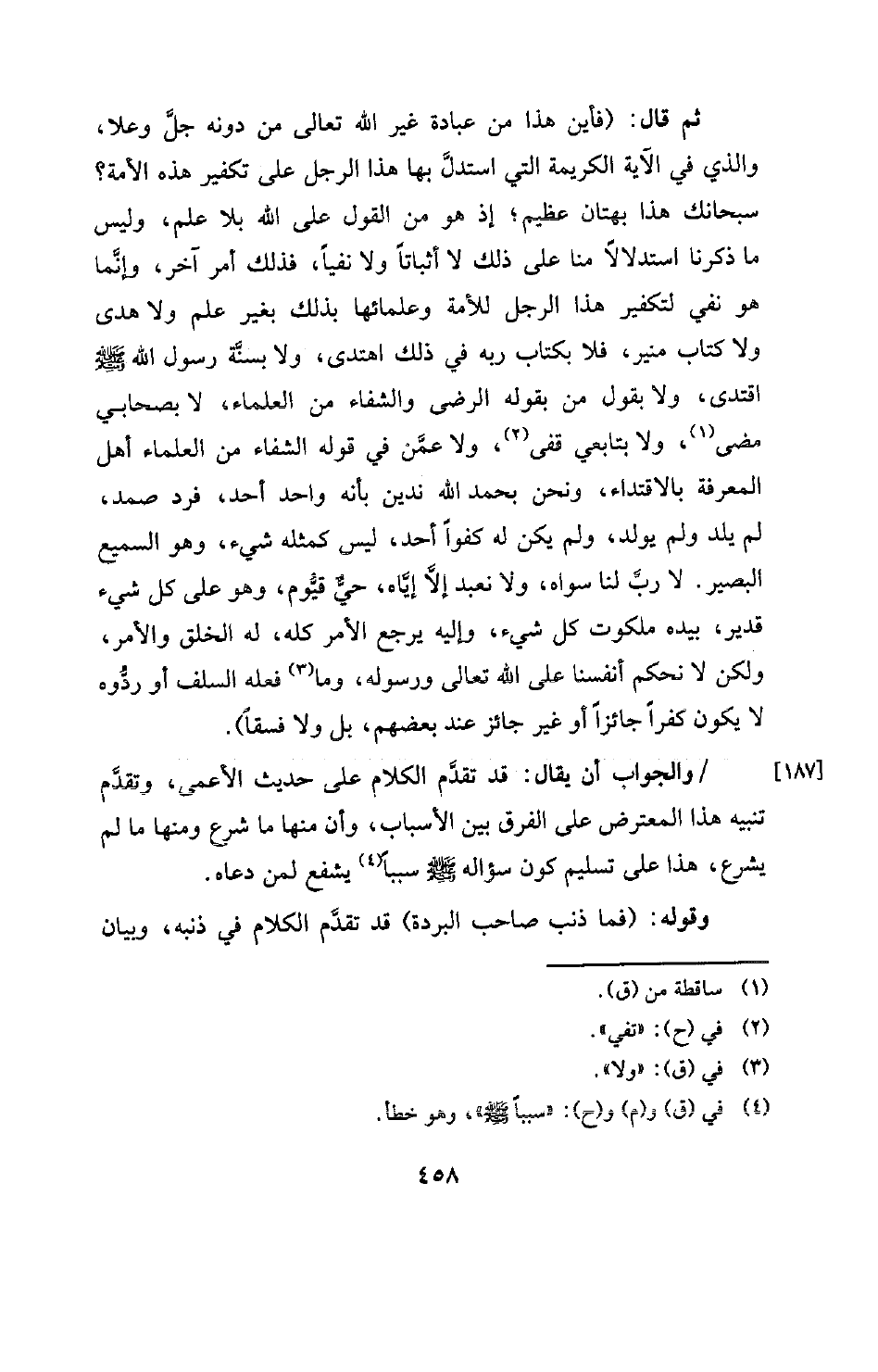 ثم قال: (فأين هذا من عبادة غير الله تعالى من دونه جلَّ وعلا، والذي في الآية الكريمة التي استدل بها هذا الرجل على تكفير هذه الأمة؟ سبحانك هذا بهتان عظيم؟ إذ هو من القول على الله بلا علم، وليس ما ذكرنا استدلالا منا على ذلك لا إثباتا ولا نفيا، فذلك أمر آخر، وإنما هو نفي لتكفير هذا الرجل للأمة وعلمائها بذلك بغير علم ولا هدى ولا كتاب منير، فلا بكتاب ربه في ذلك اهتدى، ولا بسنَّة رسول الله -صلى الله عليه وسلم- اقتدى، ولا بقول من بقوله الرضى والشفاء من العلماء، لا بصحابي مضى (¬1) ولا بتابعي قفى (¬2) ولا عمن في قوله الشفاء من العلماء أهل المعرفة بالاقتداء، ونحن بحمد الله ندين بأنه واحد أحد، فرد صمد، لم يلد ولم يولد، ولم يكن له كفوا أحد، ليس كمثله شيء، وهو السميع البصير. لا رب لنا سواه، ولا نعبد إلا إيَّاه، حيّ قيُّوم، وهو على كل شيء قدير، بيده ملكوت كل شيء وإليه يرجع الأمر كله له الخلق والأمر، ولكن لا نحكم أنفسنا على الله تعالى ورسوله، وما (¬3) فعله السلف أو ردوه لا يكون كفرا جائزا أو غير جائز عند بعضهم، بل ولا فسقا) .